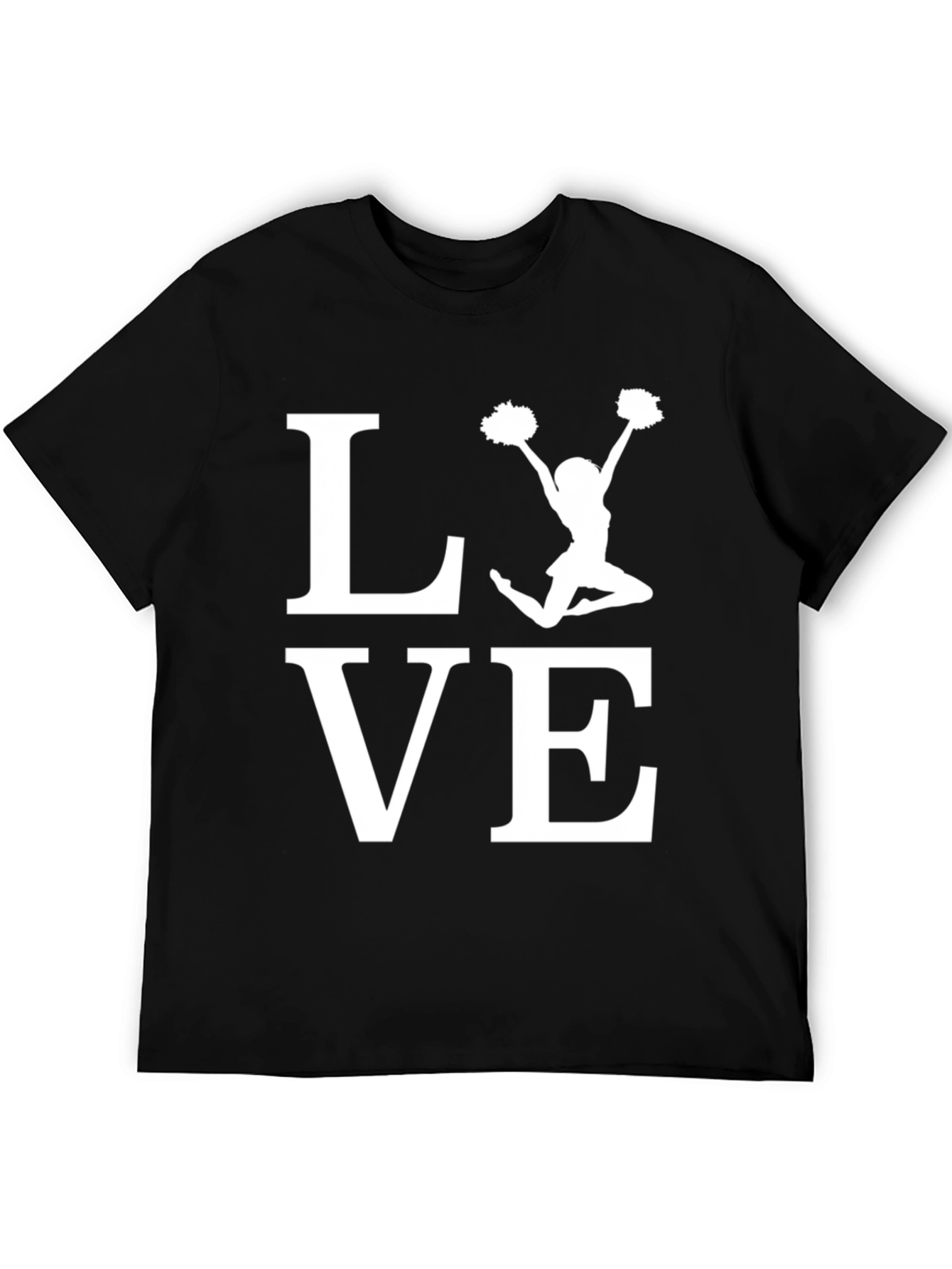 Show your love for cheerleading with this stylish black t-shirt! Featuring a playful "LOVE" graphic where the 'O' is replaced by a silhouette of a cheerleader in mid-jump with pom-poms, this tee is a fun way to express your passion. Made from what appears to be a comfortable cotton blend, this short-sleeved shirt is perfect for casual wear, cheer practice, or showing your support at games. The classic black color makes it easy to pair with any outfit. Whether you're a cheerleader yourself or simply a fan, this t-shirt is a must-have addition to your wardrobe. Grab yours today and cheer in style!