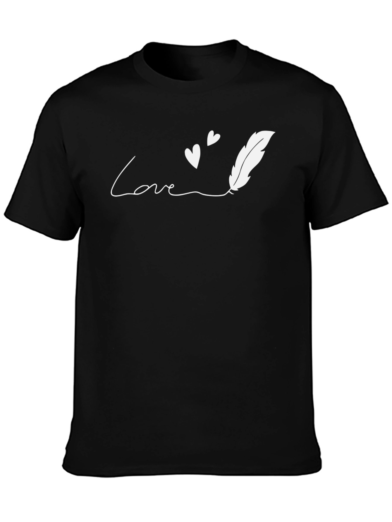 Express your love for art and style with this unique black t-shirt. The tee features a delicate "Love" script, complemented by two charming hearts and an elegant feather design, all in a crisp white print. Made from a soft, comfortable fabric, this shirt is perfect for everyday wear. The classic crew neck and short sleeves offer a relaxed fit, making it suitable for casual outings, lounging at home, or layering under a jacket. Show off your artistic side with this eye-catching and comfortable tee. Perfect gift for the style-conscious.