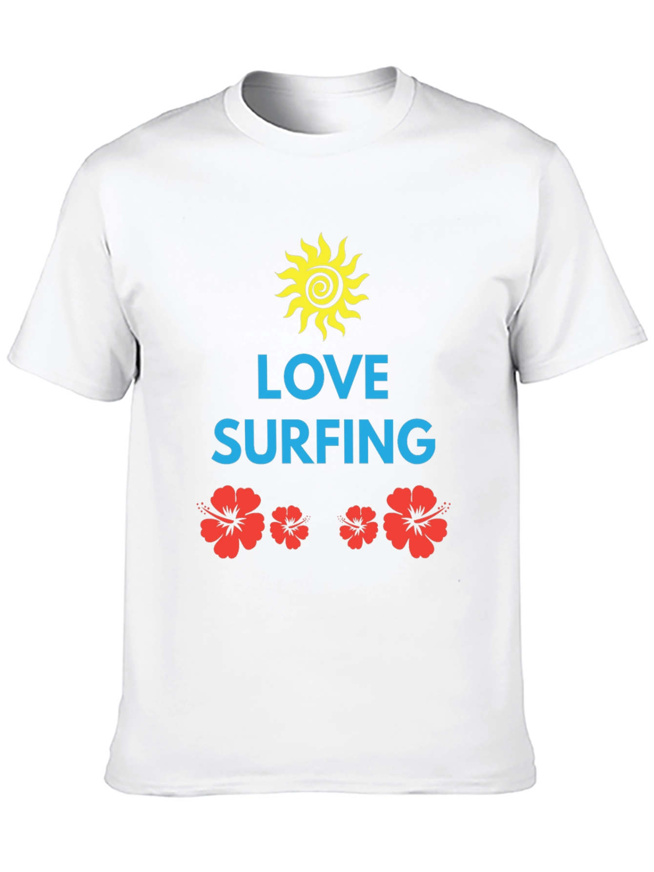Embrace the surf lifestyle with this stylish black graphic tee. Featuring a vibrant sun graphic above the phrase "Love Surfing" in eye-catching blue lettering, and adorned with a series of red hibiscus flowers, this shirt is perfect for beach lovers and surfing enthusiasts. Made from what appears to be a comfortable and breathable fabric, it's ideal for everyday wear or your next surf adventure. Show off your passion for the ocean with this standout tee. Perfect for casual outings, beach days, or simply expressing your love for surfing. Available in various sizes.