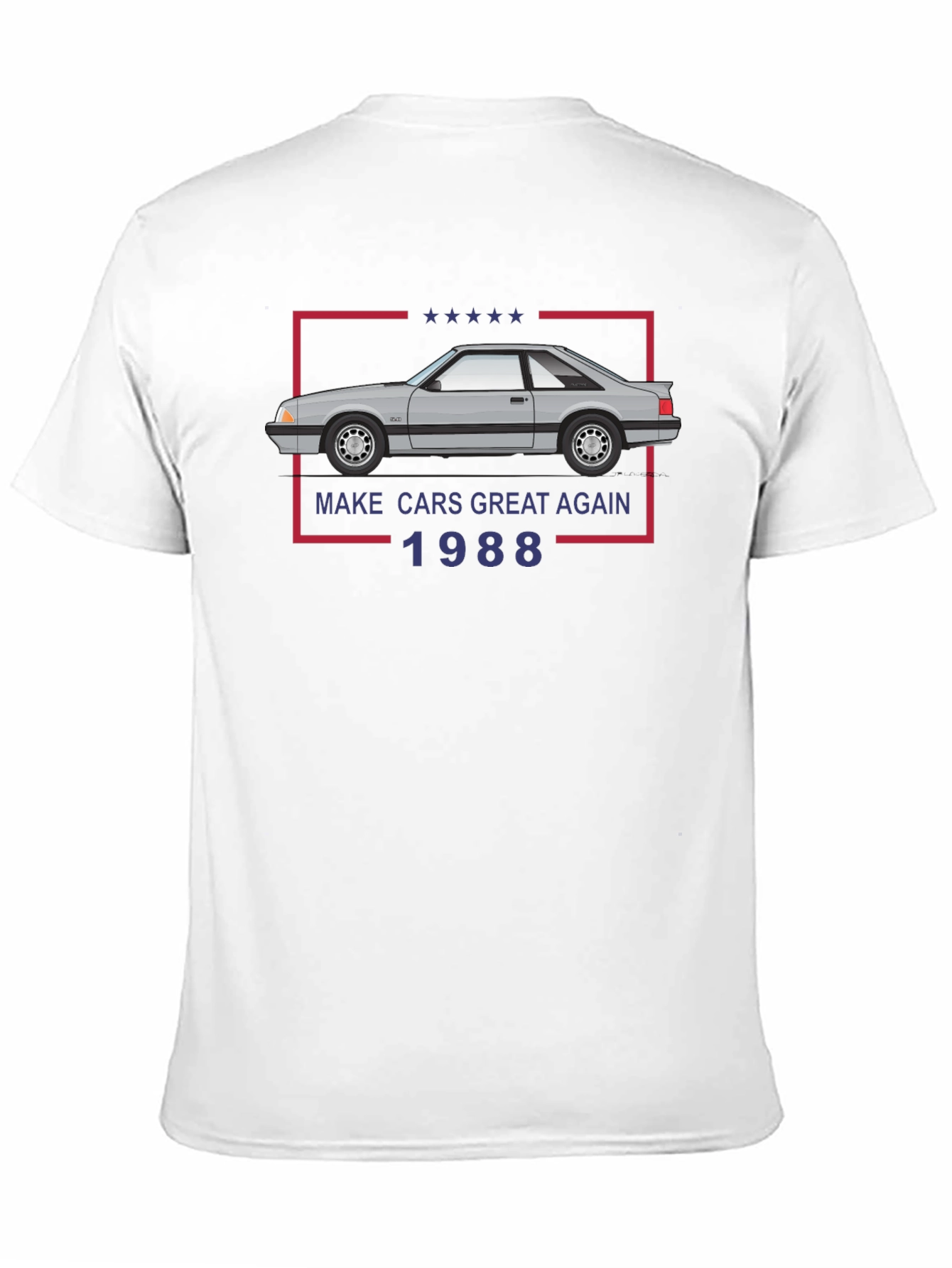 Show your love for classic cars with this eye-catching black t-shirt. The design features a stylized silver coupe graphic framed by red and blue lines, complete with stars and the slogan "Make Cars Great Again 1988". Made from comfortable fabric, this shirt is perfect for casual wear, car shows, or as a unique gift for any automotive enthusiast. Stand out from the crowd and celebrate a great era of automotive design with this retro-inspired tee. Its bold graphic and political slogan make it a great conversation starter and a must-have for any car lover's wardrobe.
