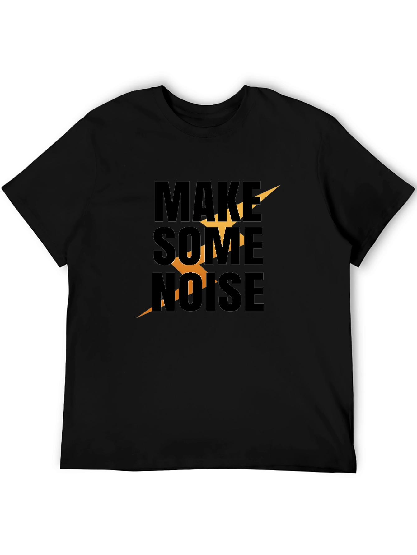 Make a statement with this bold black graphic tee! Featuring the phrase 'Make Some Noise' with a striking lightning bolt design, this t-shirt is perfect for those who want to stand out. The text and lightning bolt design create a visually appealing contrast against the solid black background. Made from comfortable, breathable fabric, this tee is ideal for casual outings, concerts, or making a statement wherever you go. The classic fit ensures all-day comfort. Wear your passion and let your voice be heard with this unique and stylish t-shirt.