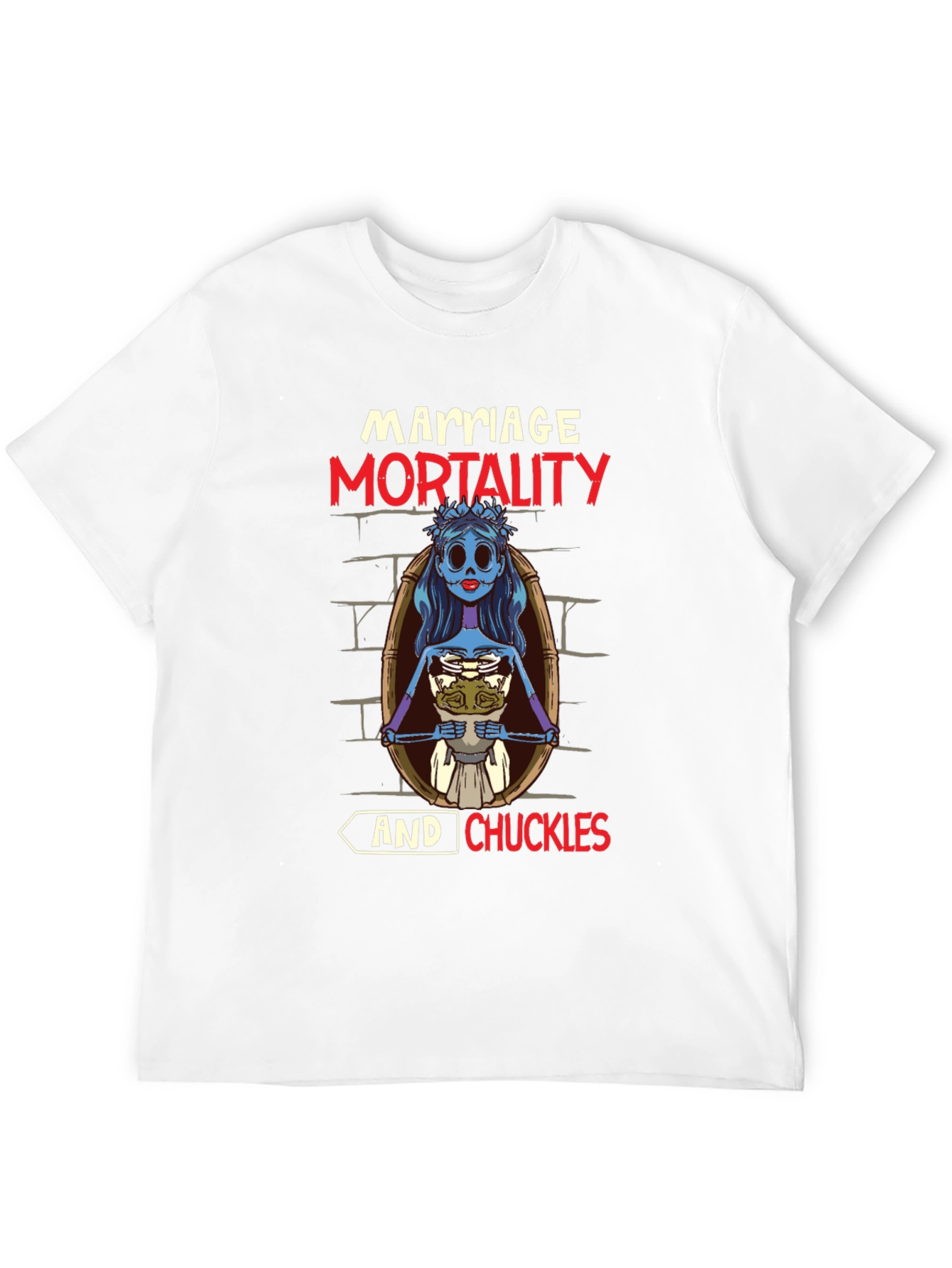 This black T-shirt features a captivating graphic design that's sure to spark conversation. The central image showcases a stylized, skeletal bride figure set against a faux brick wall backdrop. Above the bride, the words "Marriage Mortality" are printed in contrasting fonts, while "And Chuckles" sits below, creating a playful yet macabre theme. Made from what appears to be soft, comfortable cotton, this tee is perfect for casual wear. The print has a slightly distressed, vintage feel. It's ideal for those with a dark sense of humor, fans of gothic art, or anyone looking to add a unique piece to their wardrobe. Wear it to social gatherings, themed parties, or simply as an everyday statement piece.