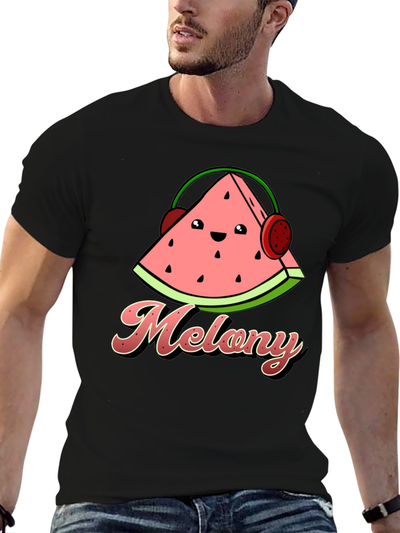 Show off your fun side with this adorable "Melony" t-shirt! This black tee features a cute cartoon watermelon slice wearing headphones, perfect for music lovers and fruit enthusiasts alike. The playful graphic and stylish font make this shirt a standout piece in any casual wardrobe. Made from a comfortable, breathable fabric, it's ideal for everyday wear, concerts, or lounging around. Grab yours today and spread some fruity vibes!