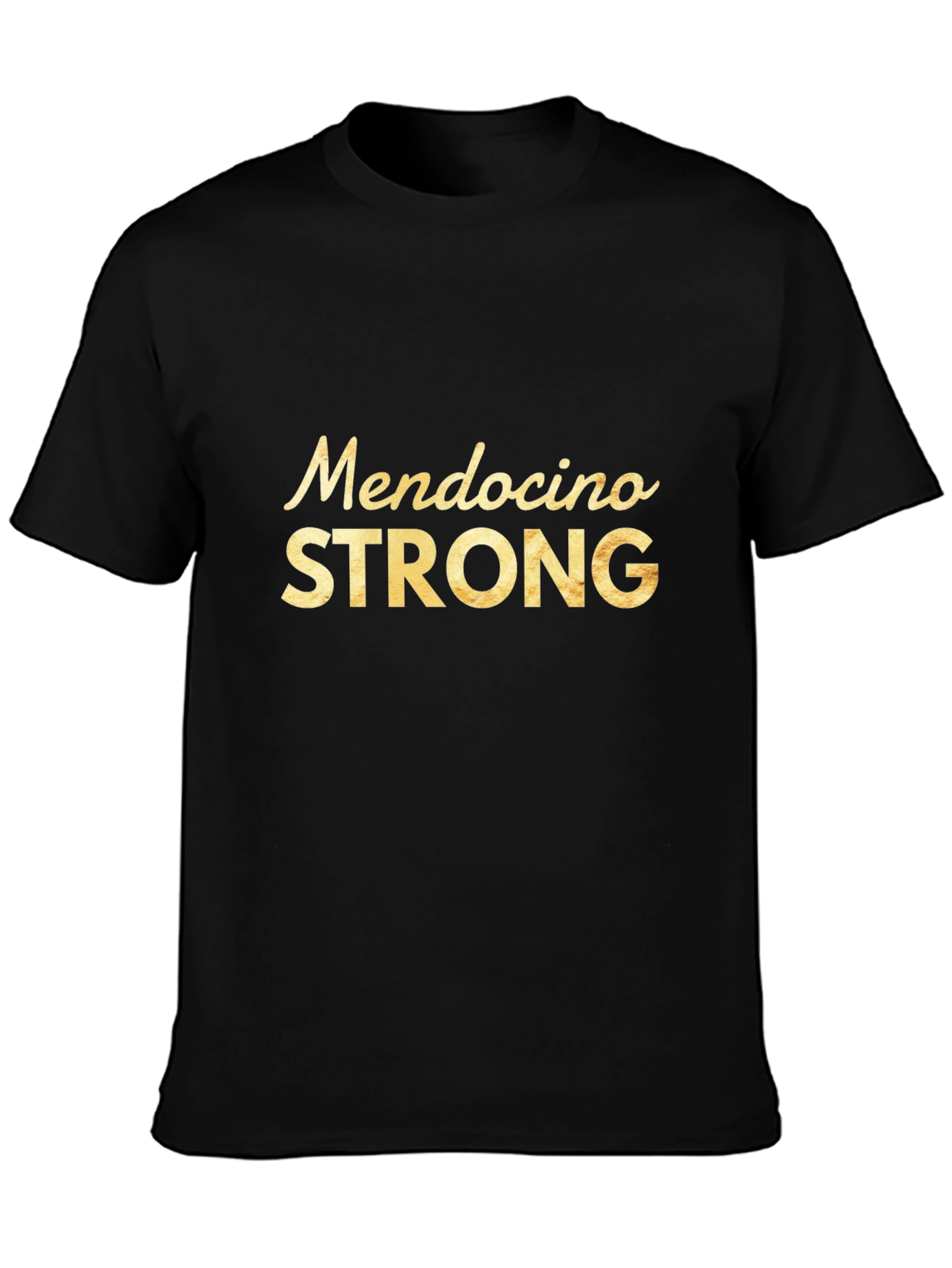 Show your support with this striking black graphic tee. The shirt features the text "Mendocino STRONG" in a bold, golden-toned font, making a powerful statement. Crafted from a comfortable-looking fabric, this tee is perfect for everyday wear. The design is simple yet impactful, suitable for various casual settings. Whether you're a resident, a supporter, or simply love the message, this shirt is a stylish way to express solidarity and resilience. Pair it with jeans, shorts, or your favorite casual bottoms for a relaxed, meaningful look.