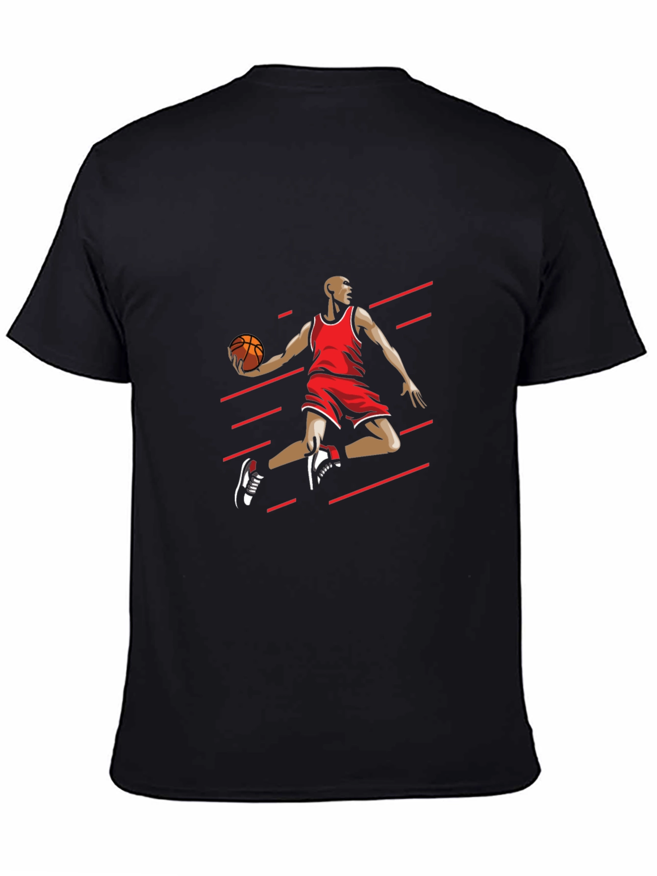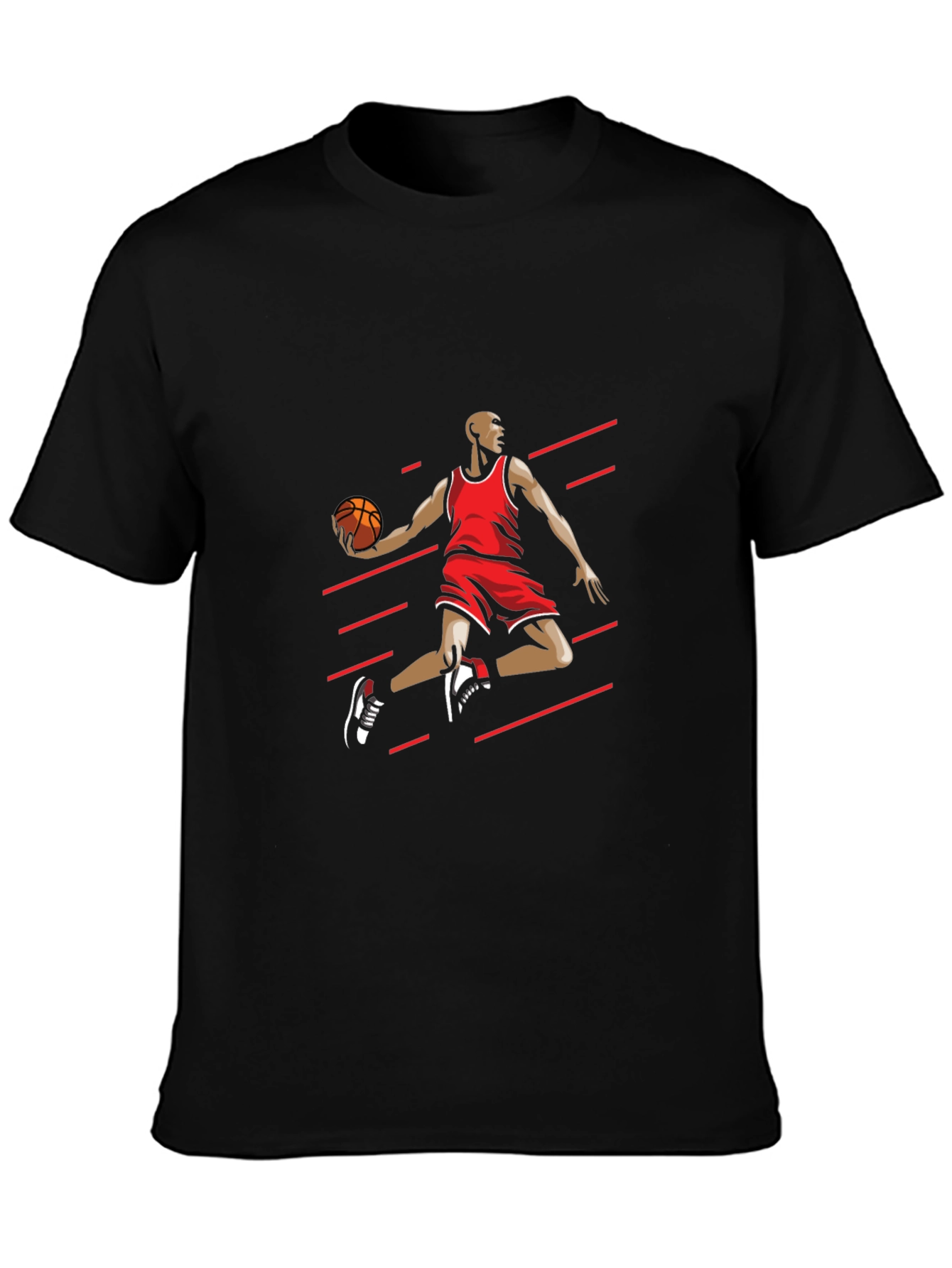 Elevate your casual wardrobe with this stylish men's black t-shirt. Crafted from a soft, comfortable fabric, this tee features a bold graphic print of a basketball player in action, complete with red accents for a sporty edge. The classic crew neck design ensures a timeless fit, making it perfect for everyday wear. Whether you're hitting the gym, running errands, or just hanging out with friends, this t-shirt combines comfort and style effortlessly. Show off your love for basketball with this eye-catching and versatile piece. A must-have addition to any man's closet.