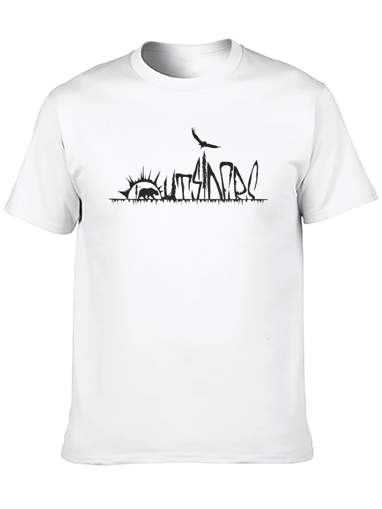 This classic black tee features a unique, abstract print across the chest, perfect for showcasing your love for the outdoors. The design includes silhouettes of natural elements, creating a striking visual statement. Made from a soft, comfortable fabric, this shirt is ideal for everyday wear. Its casual style makes it versatile for pairing with jeans, shorts, or layering under a jacket. Whether you're exploring the city or relaxing at home, this t-shirt offers both style and comfort. Upgrade your wardrobe with this eye-catching piece that blends artistic design with everyday functionality.