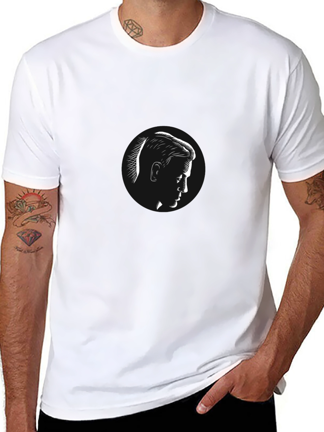 This classic men's black t-shirt features a striking white portrait graphic on the chest. The design offers a minimalist yet eye-catching aesthetic. Made from what appears to be soft, comfortable cotton, this short-sleeve shirt is ideal for everyday wear. The portrait adds a touch of sophistication making it suitable for casual outings or relaxed evenings. Its simplicity allows it to be easily paired with jeans, shorts, or layered under a jacket for a versatile addition to any wardrobe. Perfect for those who appreciate subtle yet distinctive style.