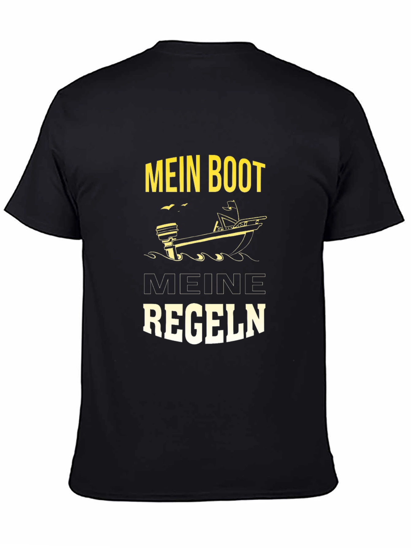 This black t-shirt features a striking graphic print that appeals to boating enthusiasts. The design includes the phrase 'Mein Boot Meine Regeln', prominently displayed above and below an illustration of a motorboat with a figure relaxing on board. The text is rendered in a bold, yellow font, providing a vibrant contrast against the shirt's dark background. Made from a soft-looking fabric, this tee offers both comfort and style. It is perfect for casual wear, boat trips, or as a statement piece for anyone who loves the nautical life. Ideal for gifting or personal use.