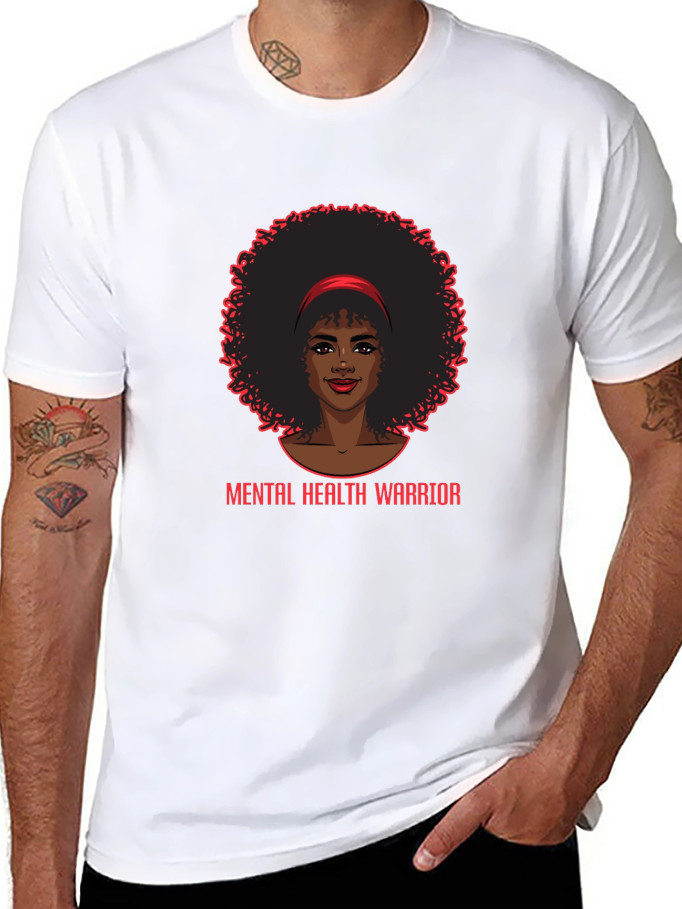 This striking black t-shirt features a bold graphic of an Afro woman encircled by a decorative red border. Beneath the image, the words "MENTAL HEALTH WARRIOR" are printed in red. Crafted from a comfortable-looking fabric, this t-shirt is perfect for anyone who wants to make a statement about mental health awareness. The classic fit makes it a versatile addition to any wardrobe, suitable for casual outings, events, or simply lounging at home. Wear your support for mental health with this eye-catching and meaningful tee.