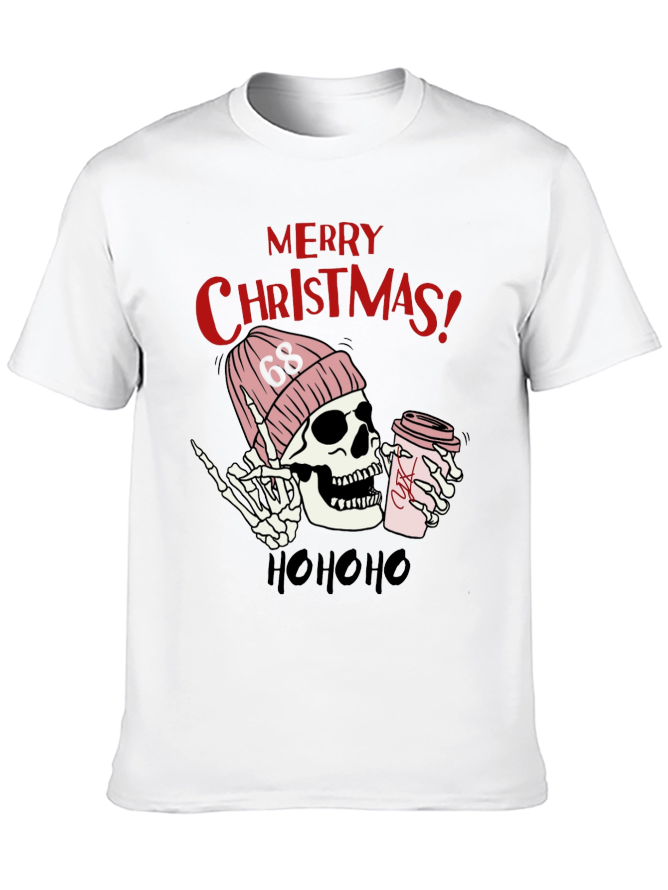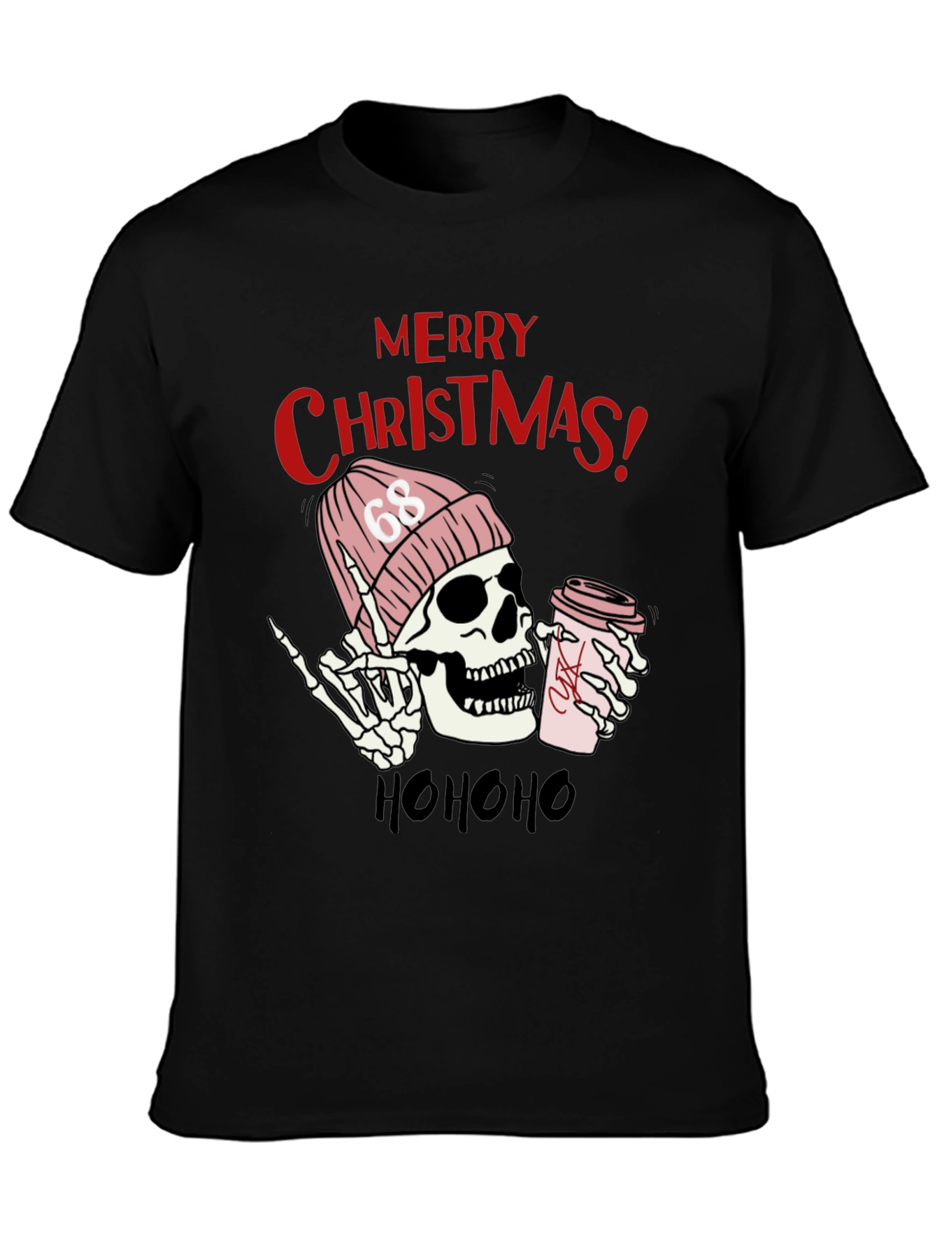 Spread holiday cheer with this unique black T-shirt. Featuring a skeleton wearing a pink beanie with the number 68, holding a matching pink cup, and sporting the words "Merry Christmas!" above and "HOHOHO" below, this shirt is sure to turn heads. Made from a comfortable fabric blend, this casual top is perfect for holiday parties, festive gatherings, or simply adding a touch of gothic style to your everyday wardrobe. Show off your sense of humor and celebrate Christmas in style with this eye-catching tee.