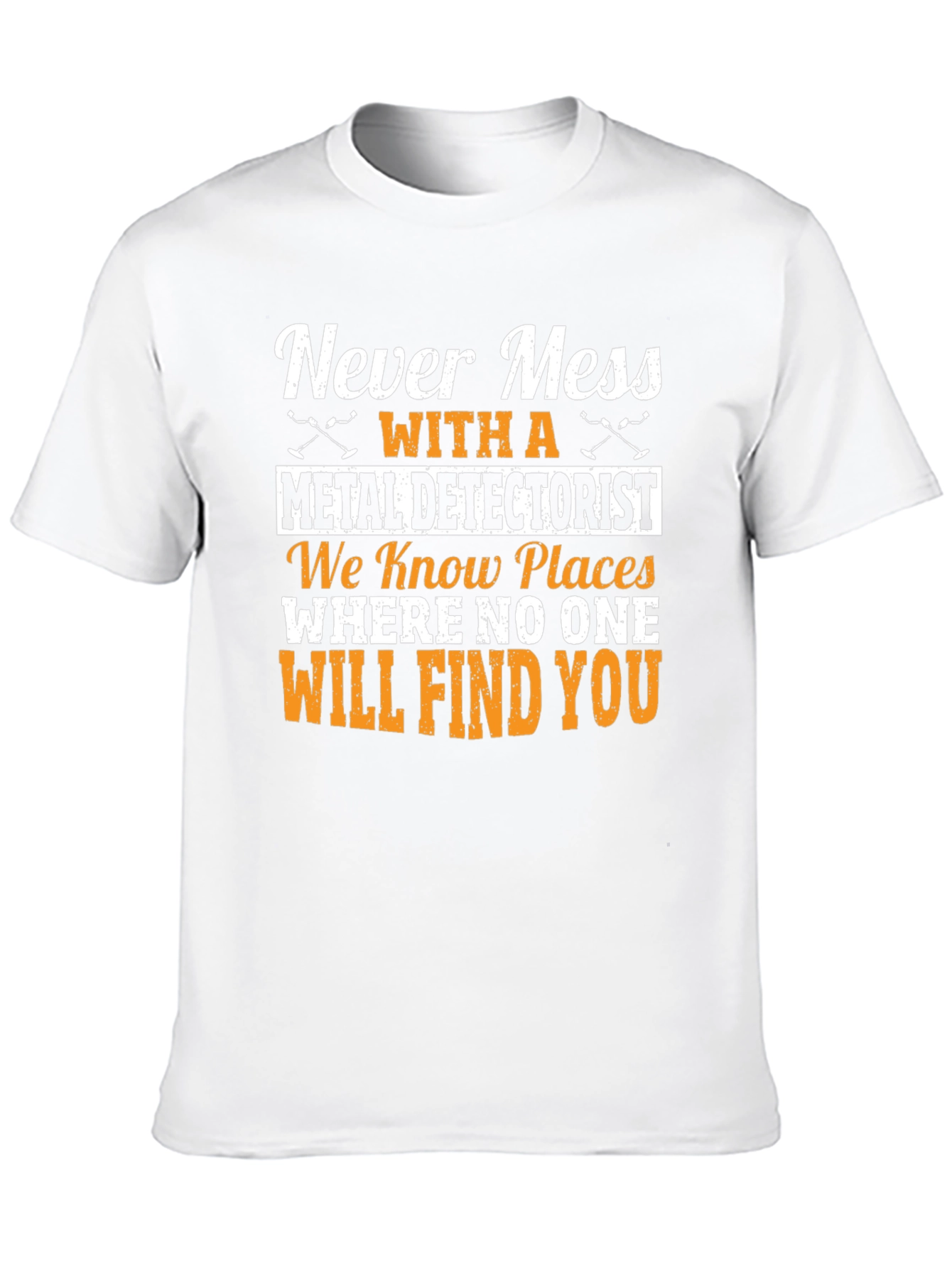 This stylish black t-shirt features a humorous and eye-catching design for metal detector enthusiasts. The bold white and gold lettering reads "Never Mess With A Metal Detectorist. We Know Places Where No One Will Find You." It's made from a soft, comfortable fabric, perfect for everyday wear. This novelty tee makes a great gift for the metal detecting hobbyist in your life. Whether they're searching beaches, fields, or historic sites, this shirt is sure to get a laugh and showcase their passion for treasure hunting. A fun and unique addition to any metal detectorist's wardrobe.