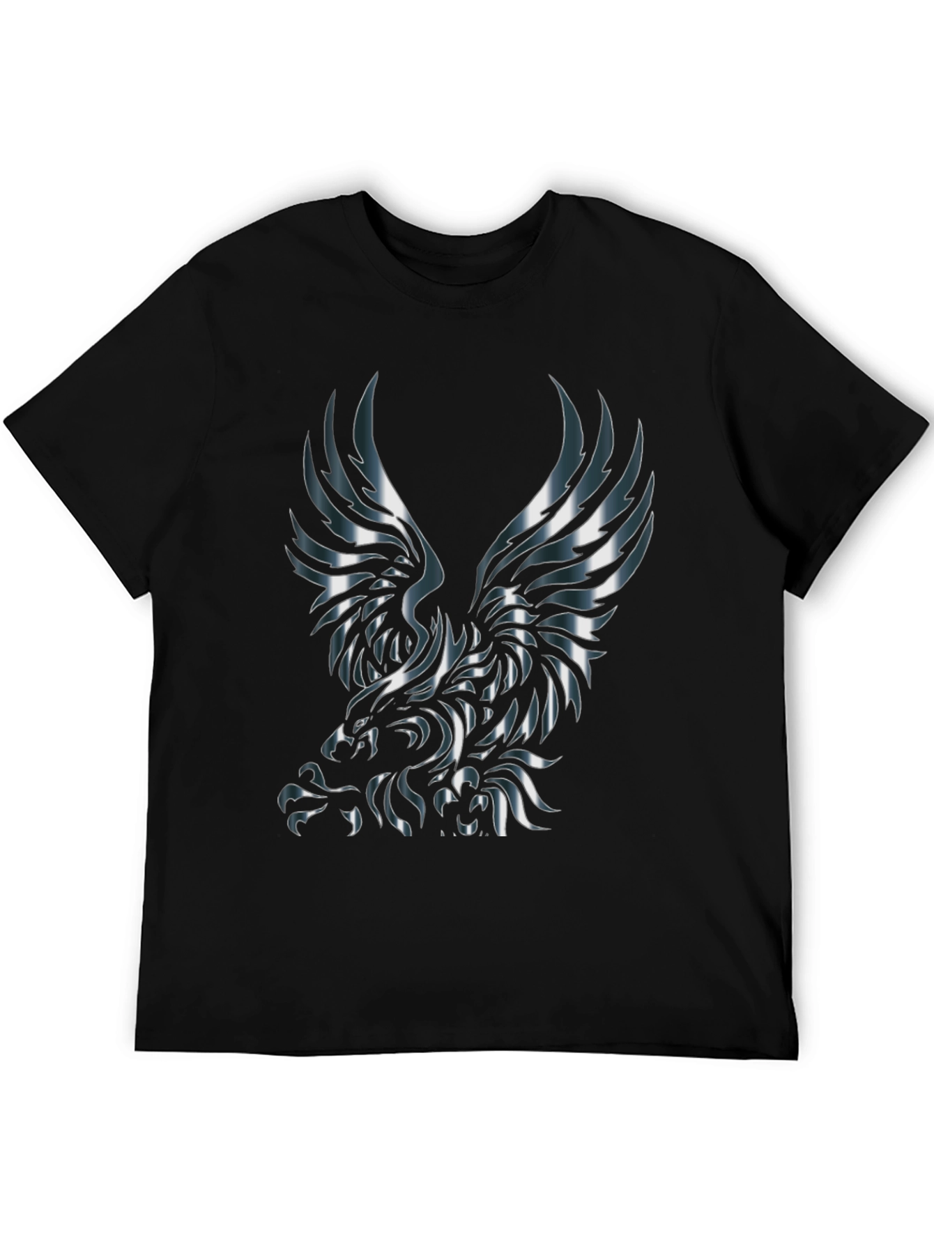 Show off your bold style with this striking black t-shirt. This short-sleeved tee features a large, eye-catching graphic of an eagle in metallic silver and gray tones. The detailed design gives a modern, edgy feel, perfect for casual outings or making a statement. Made from a comfortable fabric, this shirt is both stylish and easy to wear. Pair it with jeans or shorts for a cool, effortless look.