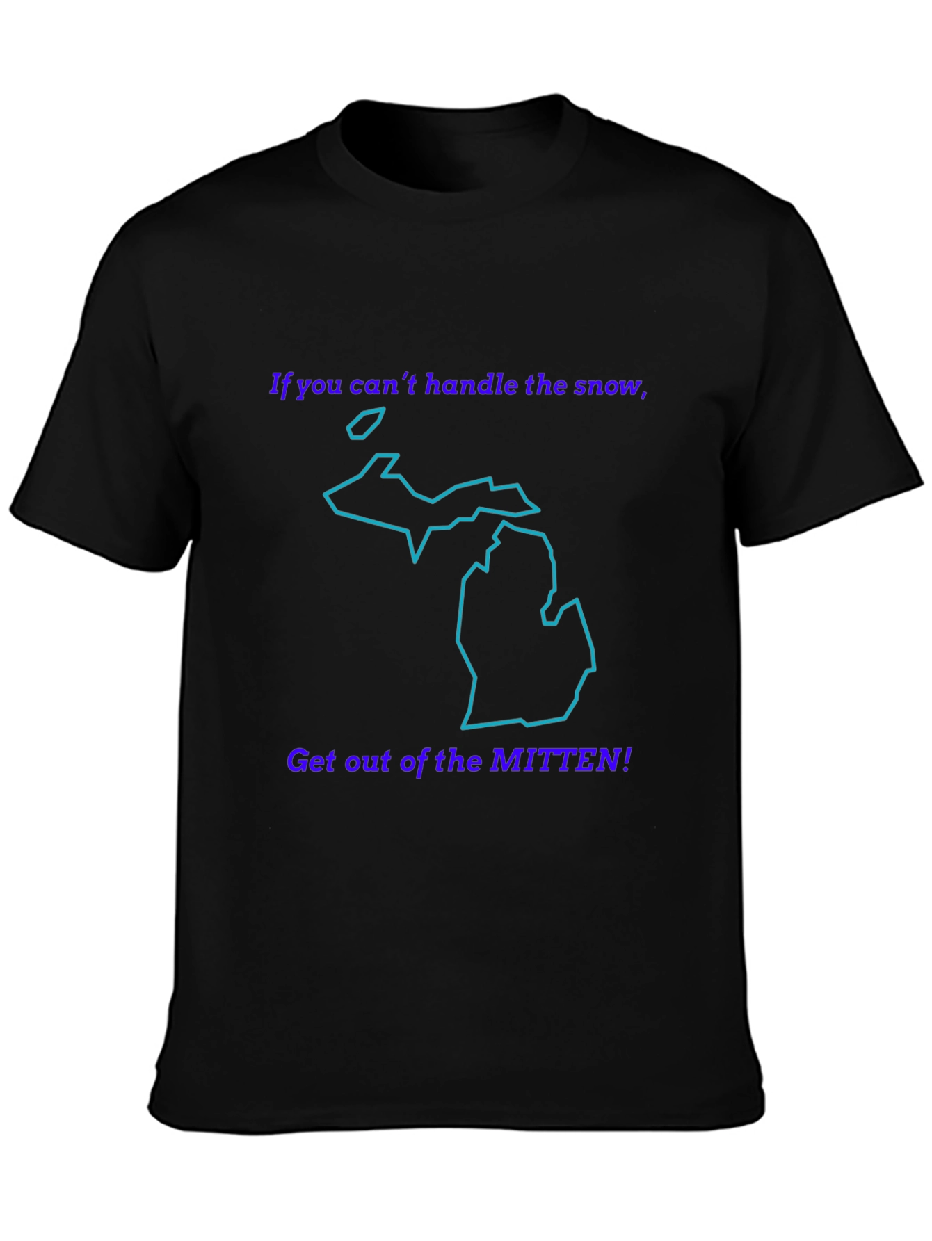 Show off your Michigan pride with this bold black t-shirt! The design features a blue outline of the state of Michigan, accompanied by the text "If you can't handle the snow, Get out of the MITTEN!" This tee is perfect for Michiganders who embrace the winter season. Made from a comfortable-looking fabric, this shirt is ideal for casual wear. Get yours today and represent the Great Lakes State in style! It's a great conversation starter and a fun way to show off your love for the Mitten.