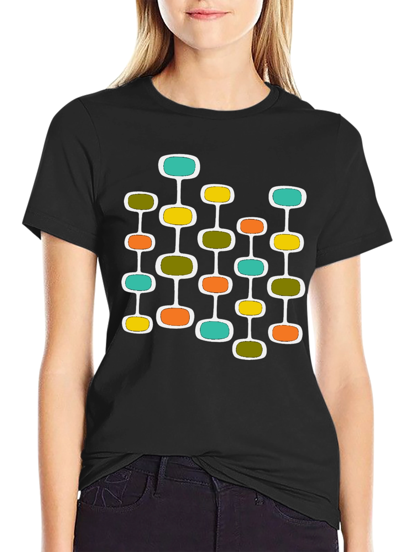 This black t-shirt features a unique mid-century modern atomic design. The graphic consists of connected oval shapes in various retro colors like teal, yellow, olive green, and orange, outlined in white. Made from what appears to be a comfortable cotton blend, this stylish tee is perfect for everyday wear. The design is eye-catching, giving it a cool, vintage vibe. Pair it with jeans or shorts for a casual look or dress it up with a blazer for a more fashionable ensemble. This shirt is a great way to add some retro flair to your wardrobe.