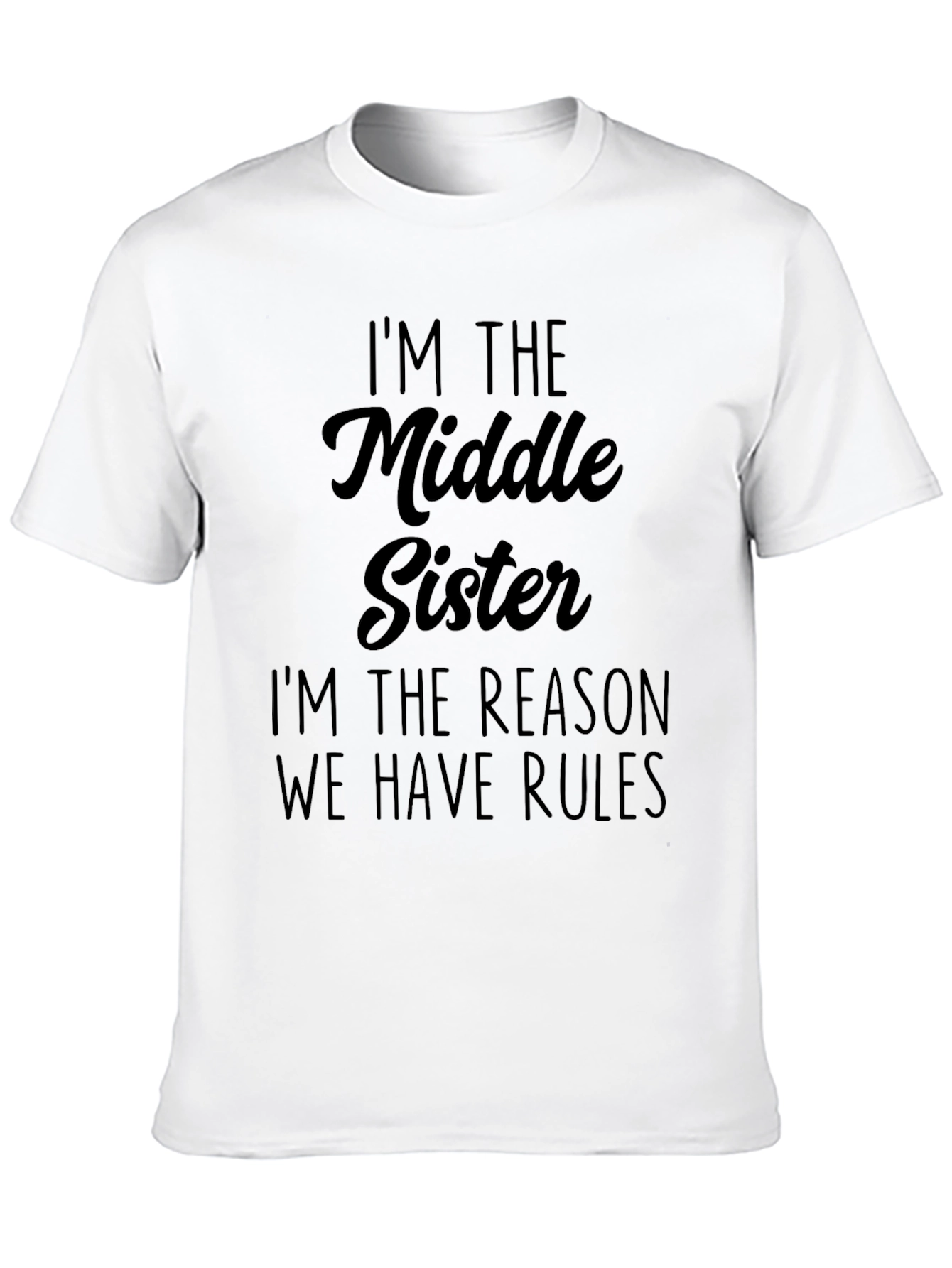 Showcase your unique middle child status with this bold black t-shirt. The tee features the statement “I’M THE Middle Sister, I'M THE REASON WE HAVE RULES” in a stylish font. Made from a soft-looking material, this shirt offers both comfort and style. Perfect for casual wear, family gatherings, or as a fun gift for the middle sister in your life. This humorous t-shirt is sure to spark conversation and showcase your personality with a touch of sibling mischief.