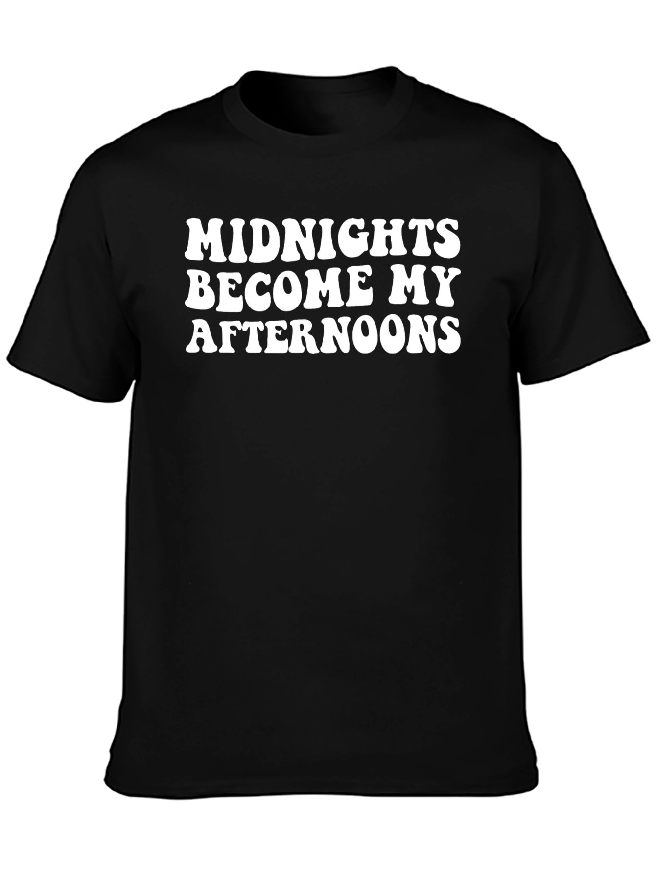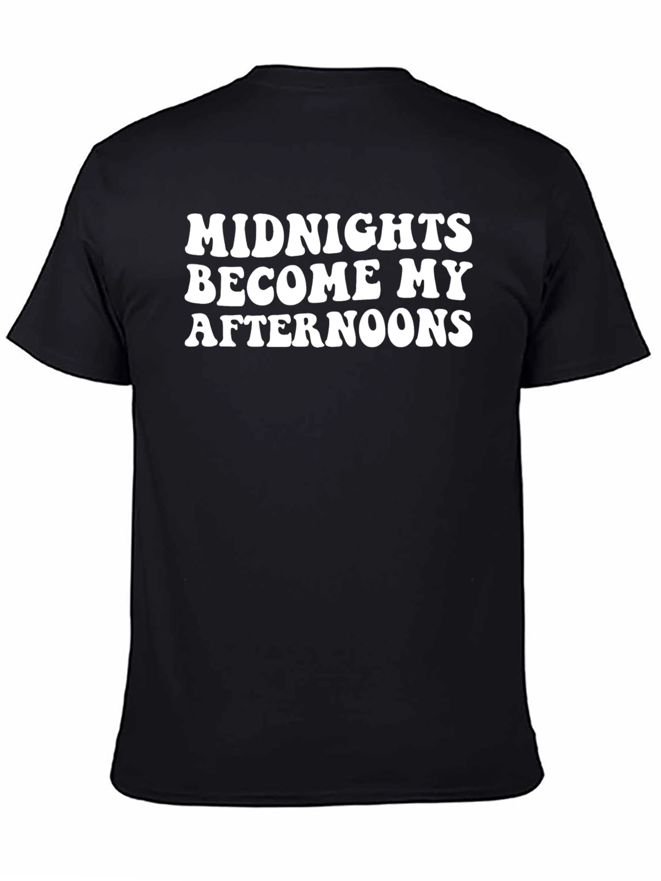 This classic black t-shirt features the phrase "Midnights Become My Afternoons" in a bold white font. Made from comfortable, breathable fabric, this tee offers a relaxed fit perfect for everyday wear. The minimalist design makes it versatile enough to pair with jeans, shorts, or even dress it up with a blazer. Show off your unique style and embrace the night owl lifestyle with this eye-catching and comfy graphic tee. Whether you're lounging at home, hitting the streets, or catching up with friends, this shirt is sure to make a statement.
