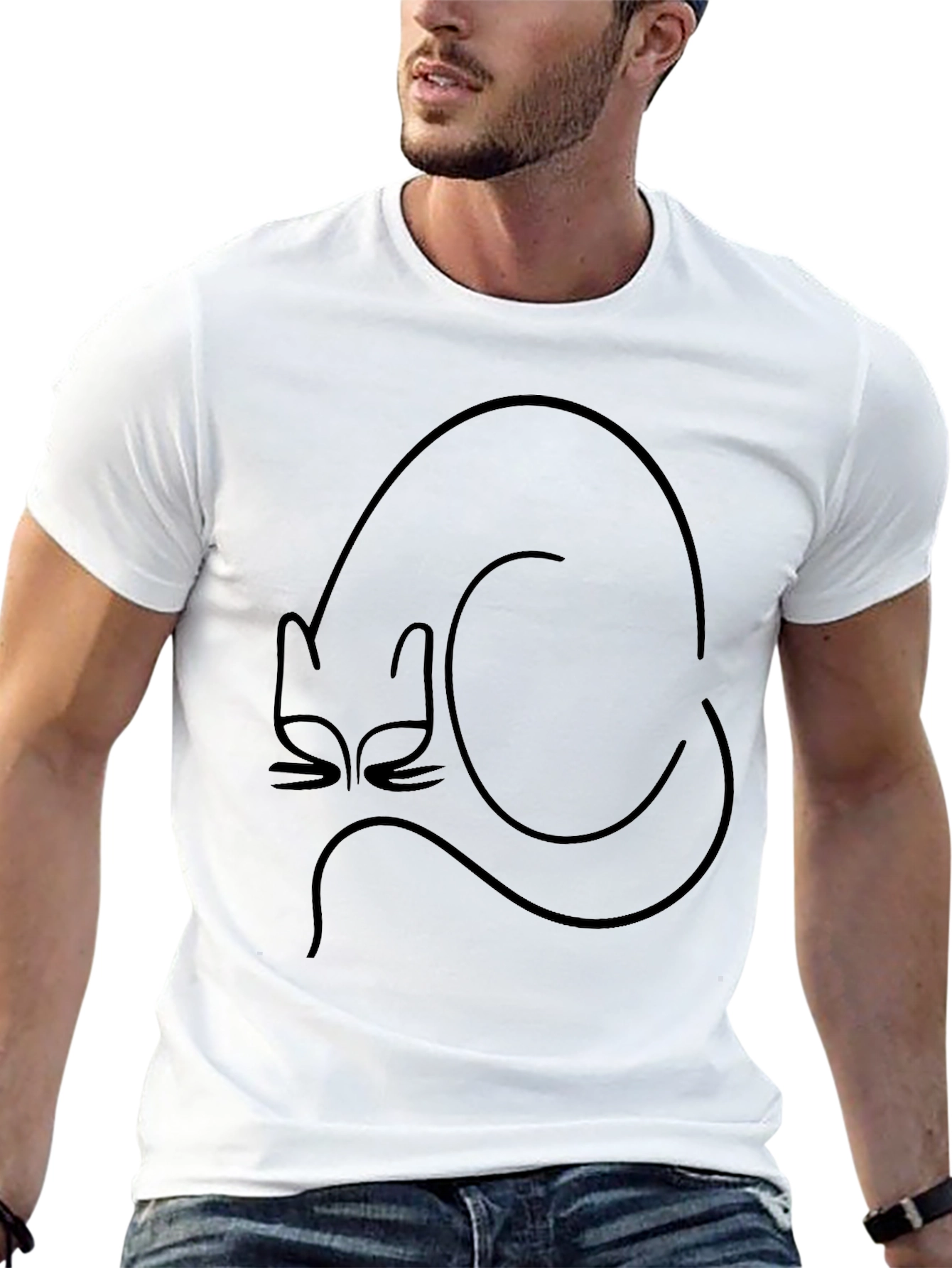This sleek black t-shirt features a minimalist outline design of a curled-up cat. The simple yet stylish graphic adds a touch of modern artistry to a classic wardrobe staple. Made from a comfortable-looking material, this tee is perfect for everyday wear. Whether you're a cat lover or appreciate understated designs, this t-shirt offers a unique and versatile addition to your casual style. Pair it with jeans or shorts for an effortlessly cool look.