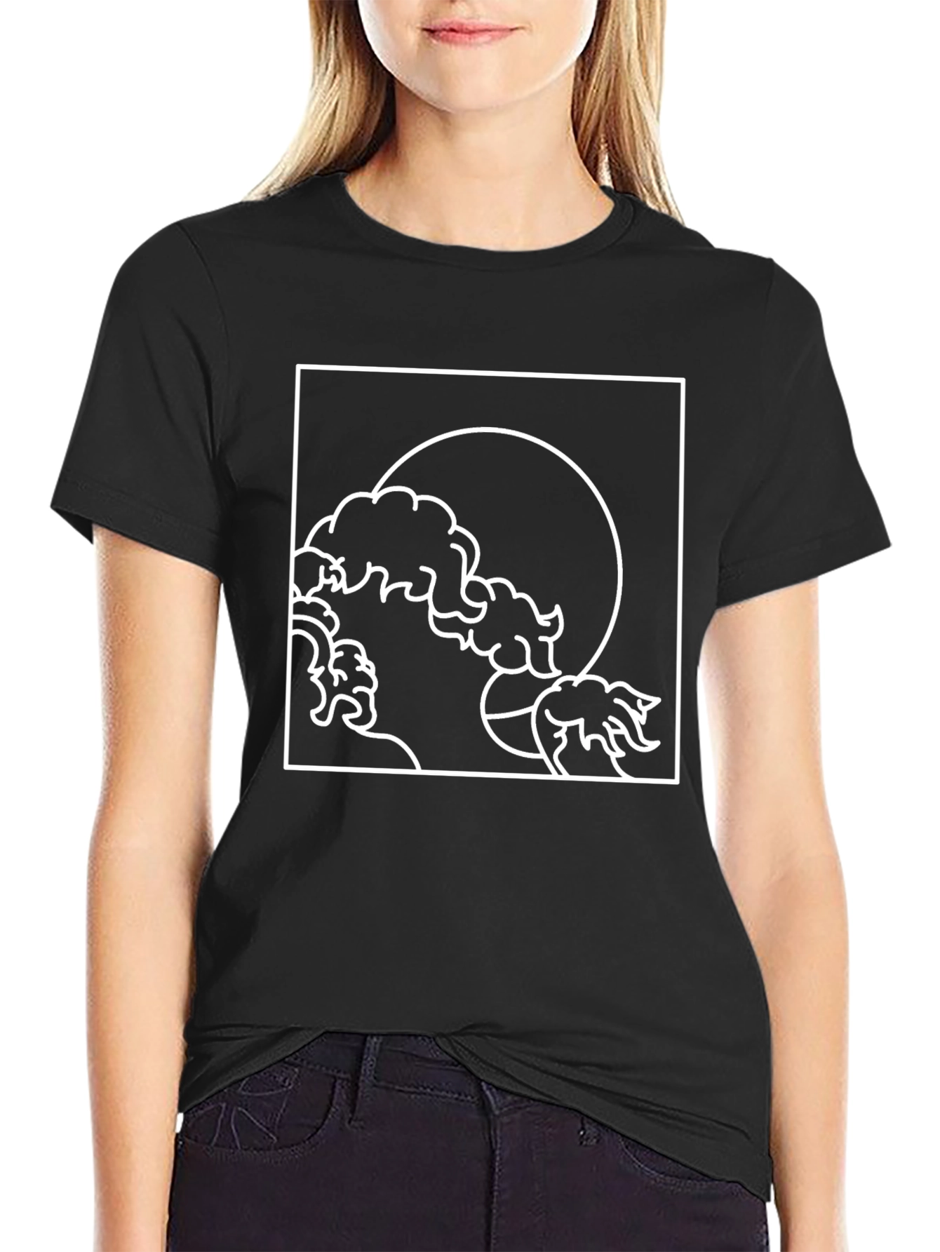 This black t-shirt features a striking minimalist design, showcasing a stylized wave and moon graphic enclosed in a square. The crisp white lines of the artwork create a bold contrast against the dark fabric, making the design pop. The tee appears to be made of a comfortable, soft cotton blend, perfect for everyday wear. Its relaxed fit allows for easy movement. Ideal for casual outings, concerts, or simply expressing your unique style. Pair it with jeans, shorts, or joggers for a trendy and comfortable look. This unique graphic tee will surely turn heads and spark conversations wherever you go.