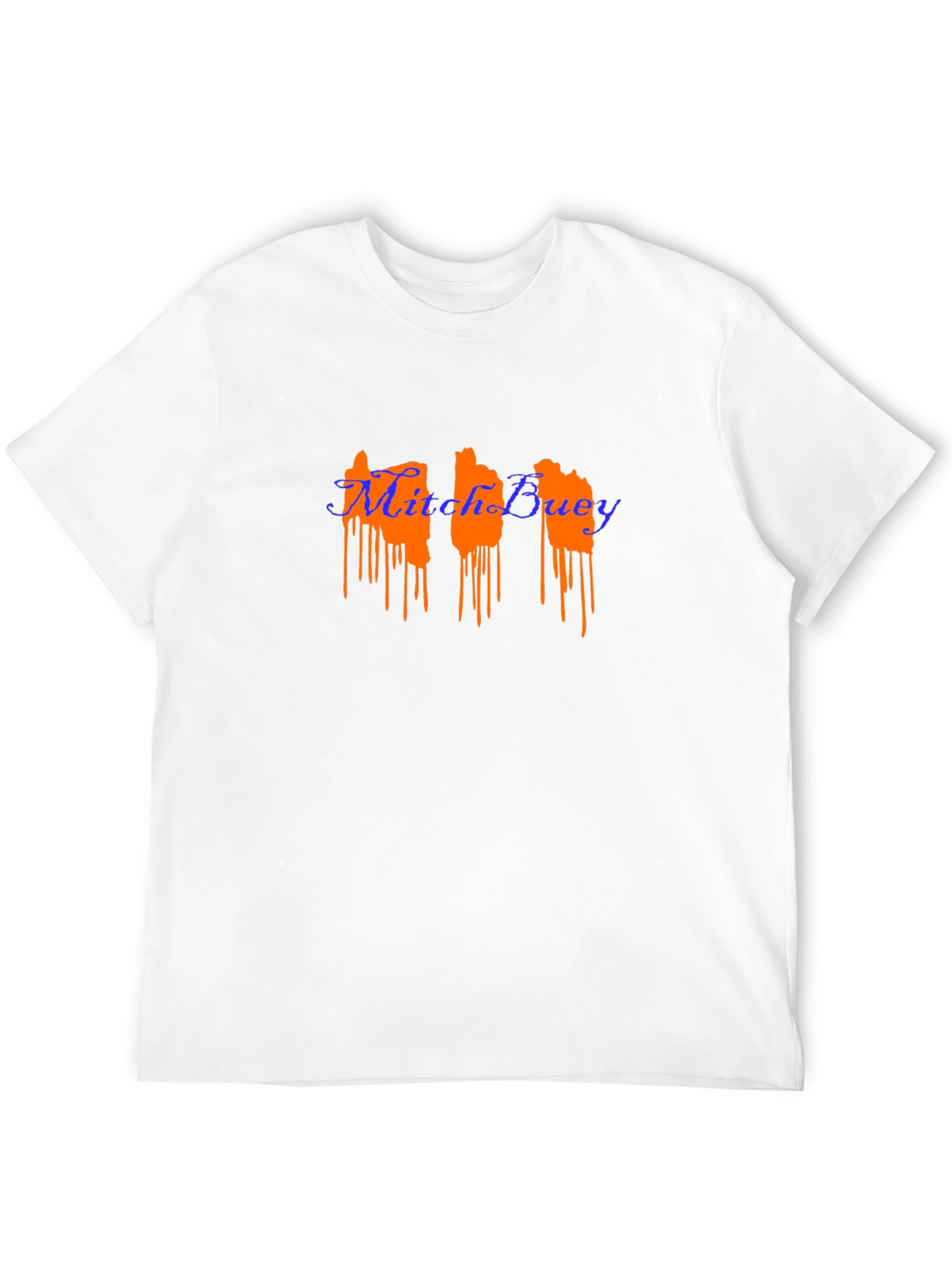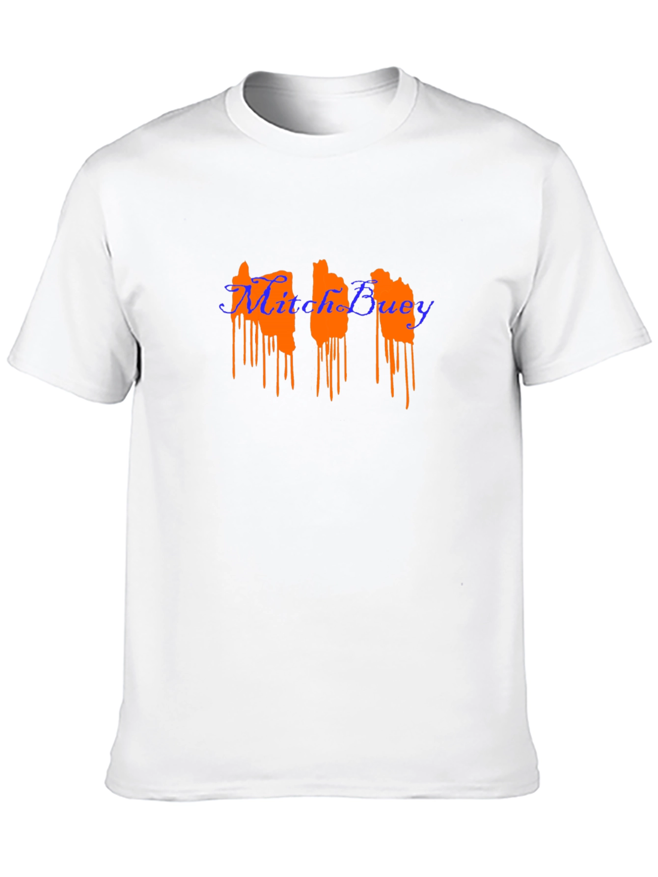 This classic black t-shirt features a unique and eye-catching design. The text "Mitch Buey" appears in bold lettering with a dripping, paint-like effect in orange and blue. Made from a comfortable-looking cotton or cotton blend fabric, this tee is perfect for casual wear. The crew neck and short sleeves offer a relaxed fit, making it ideal for everyday activities. Wear it to express your individuality or as a statement piece. This t-shirt is sure to turn heads and spark conversation wherever you go. Add this distinct design to your wardrobe today!