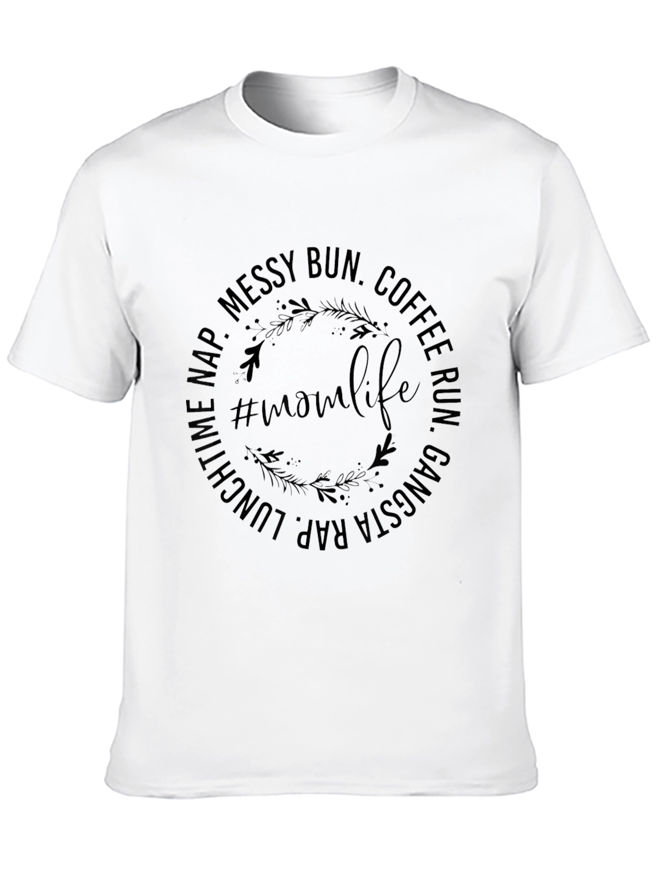 Show off your mom pride with this stylish black graphic t-shirt. The shirt features a circular design with the phrase '#momlife' at the center, surrounded by relatable mom sayings like "Messy Bun", "Coffee Run", "Gangsta Rap", and "Lunch Time Nap." Made from a soft, comfortable fabric, this tee is perfect for everyday wear, whether you're running errands, attending school events, or simply relaxing at home. The classic fit ensures a flattering silhouette. This shirt makes a great gift for any mom who wants to showcase her unique and fun personality.