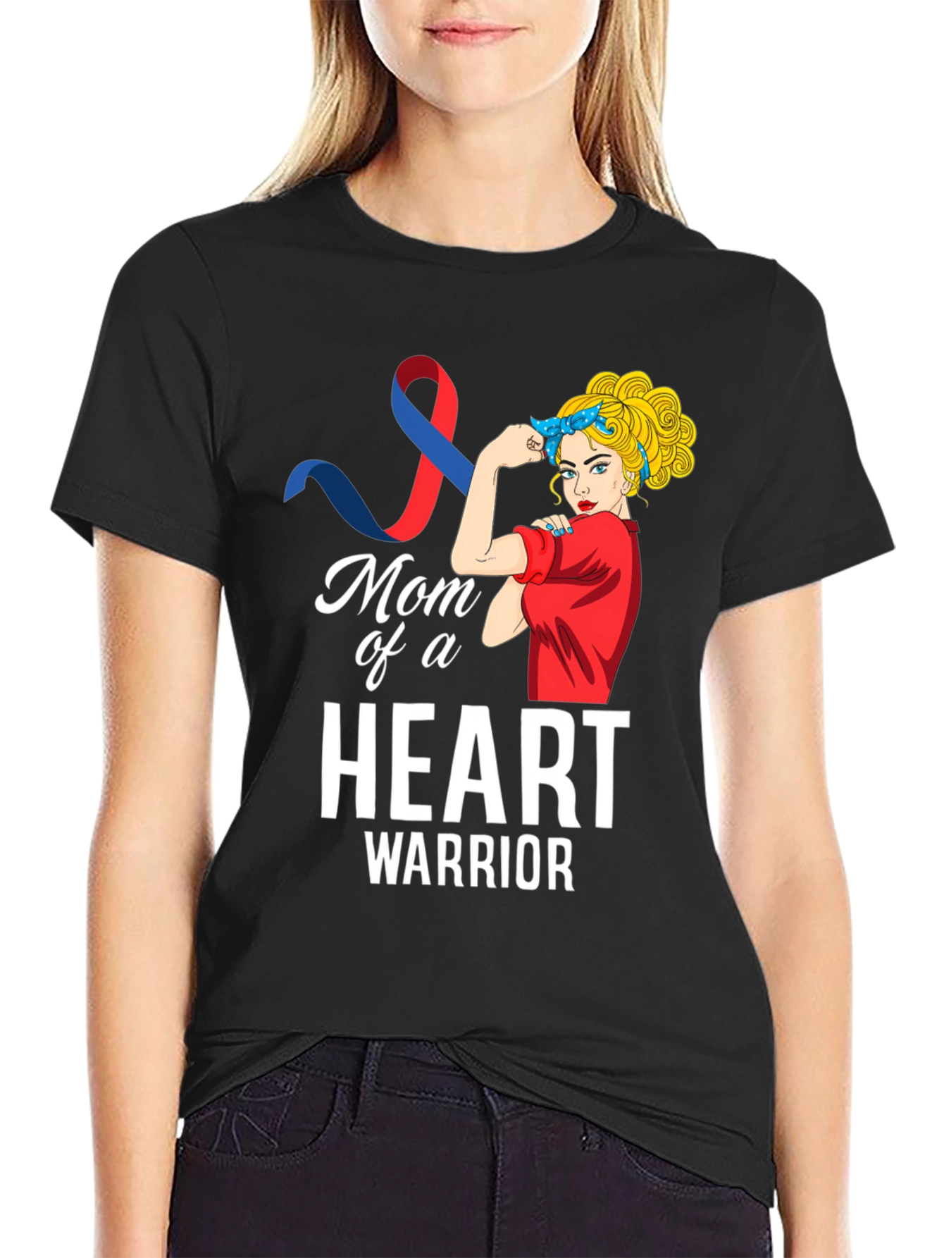 Show your support with this striking black graphic tee. The design features a vibrant ribbon with red and blue, alongside a Rosie the Riveter-inspired image, symbolizing strength and resilience. The bold text "Mom of a HEART WARRIOR" makes a powerful statement. Made from comfortable fabric, it's perfect for raising awareness or showing love for your little heart warrior. Wear it to support walks, events, or as an everyday expression of solidarity.