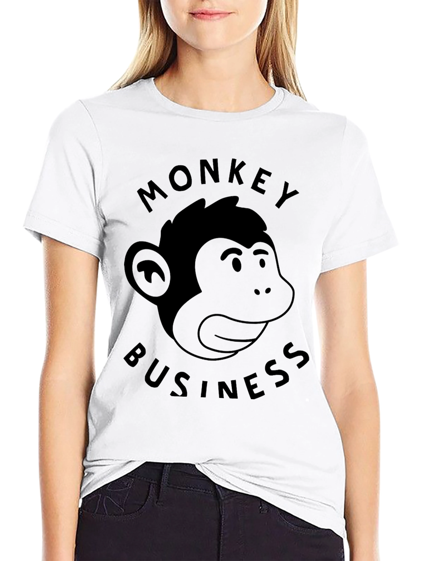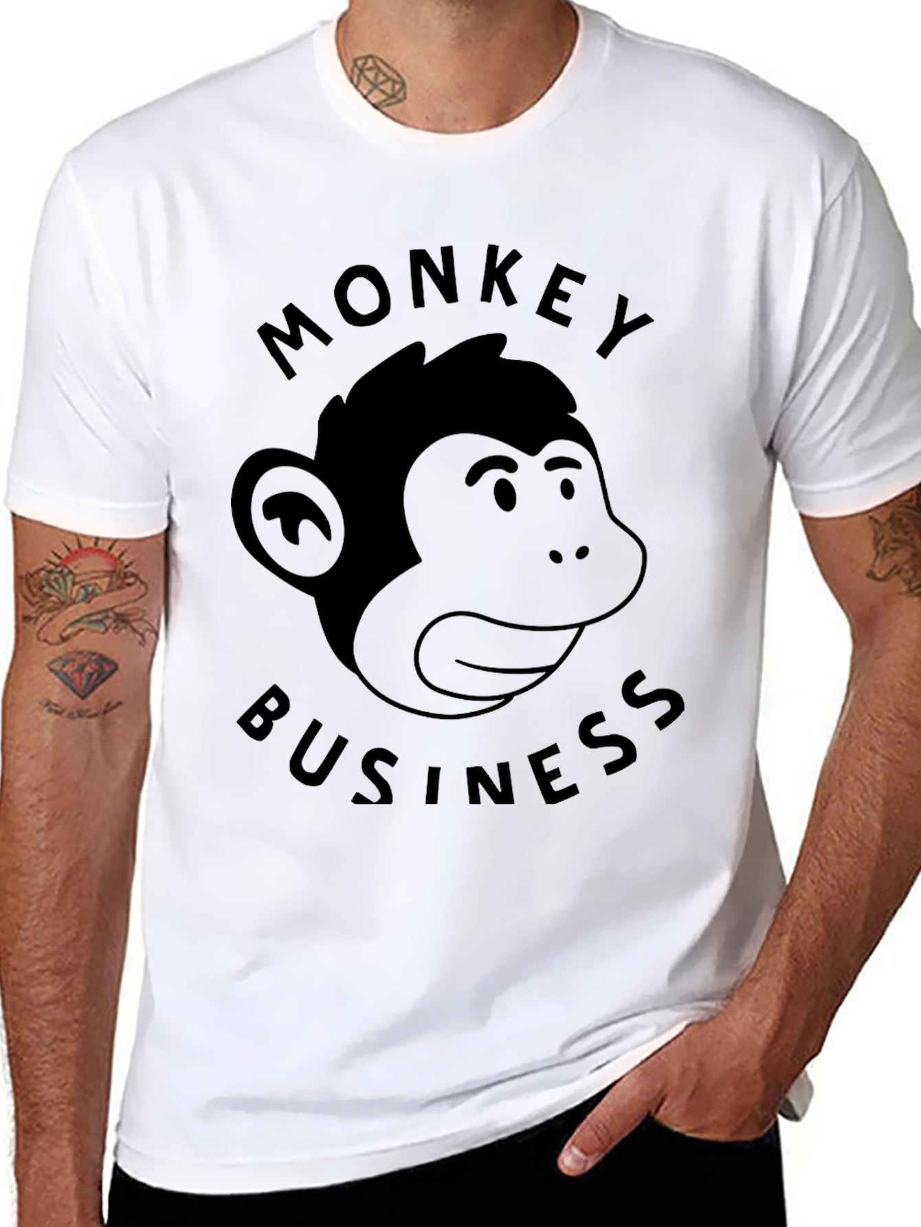 Show off your playful side with this bold black t-shirt featuring a fun "Monkey Business" graphic. The design incorporates a cute cartoon monkey face surrounded by the phrase in a circular layout. Made from comfortable, breathable fabric, this tee is perfect for everyday wear. The classic crew neck and short sleeves provide a relaxed fit, making it ideal for casual outings, lounging at home, or making a statement. Add some humor to your wardrobe with this unique and eye-catching t-shirt. Available in various sizes.