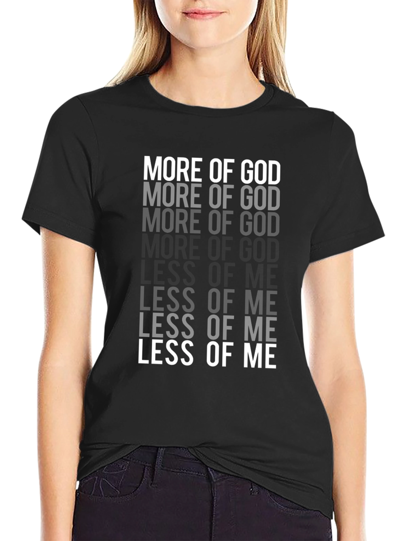 This stylish black t-shirt features the uplifting message "More of God, Less of Me" printed prominently on the front. The repeating text design adds a modern touch. Made from a soft and comfortable fabric, this tee is perfect for everyday wear and expressing your faith. Ideal for church events, casual outings, or as a thoughtful gift for fellow believers. Embrace comfort and style while spreading a powerful message. Show your devotion with this unique and inspiring t-shirt. Wear your faith proudly!