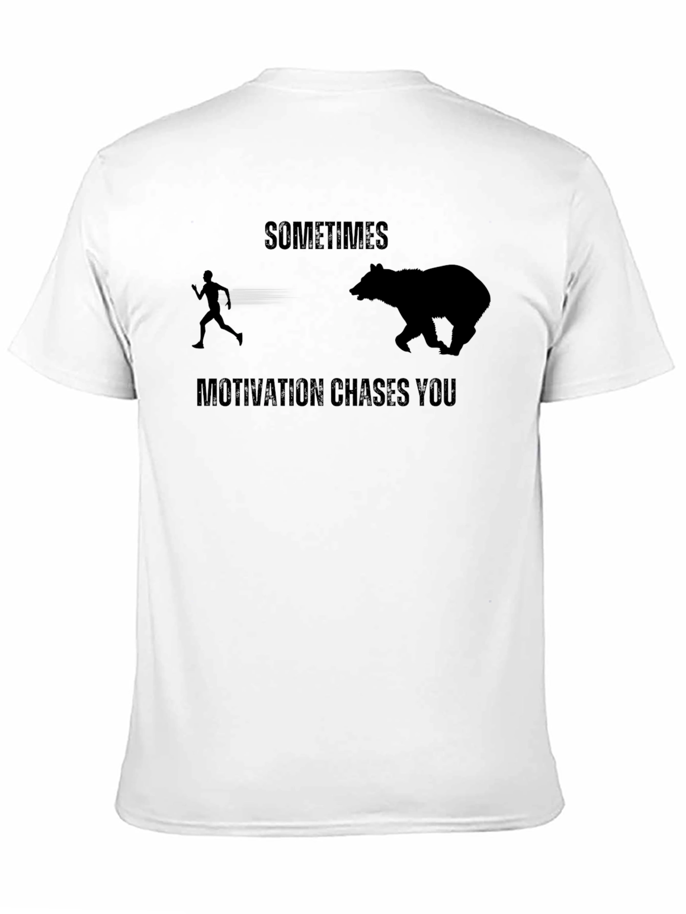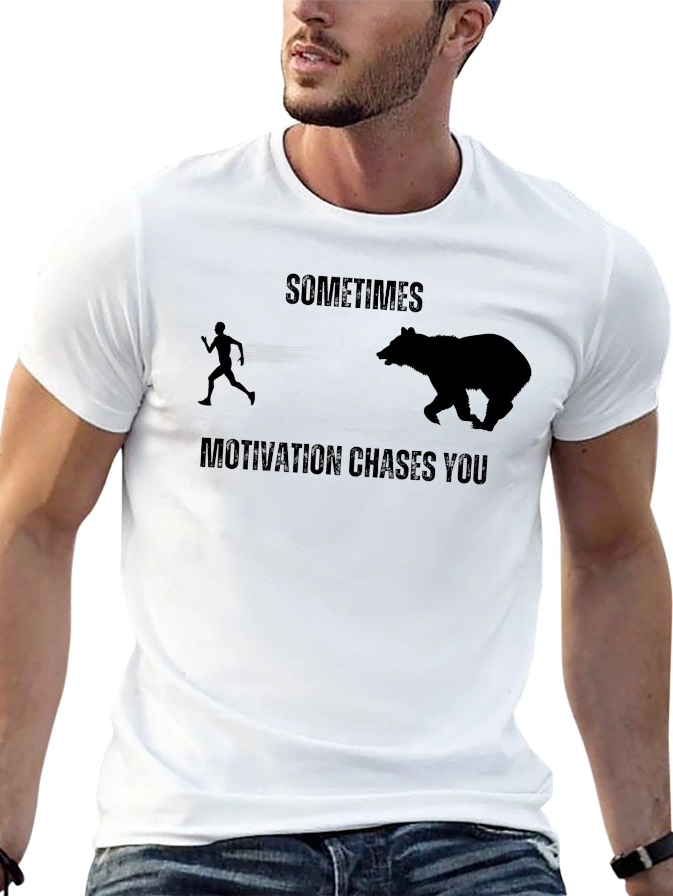 This black t-shirt features a humorous and motivational graphic. The print shows a silhouette of a person running away from a bear, with the text "SOMETIMES MOTIVATION CHASES YOU" above and below the graphic. Made from comfortable-looking fabric, this tee is perfect for workouts, casual outings, or anyone with a good sense of humor. Show off your active side (or your fear of bears!) with this unique and eye-catching t-shirt. It's a great conversation starter and a fun addition to any wardrobe. Ideal for fitness enthusiasts, outdoor lovers, or anyone who needs a little extra motivation in their life.