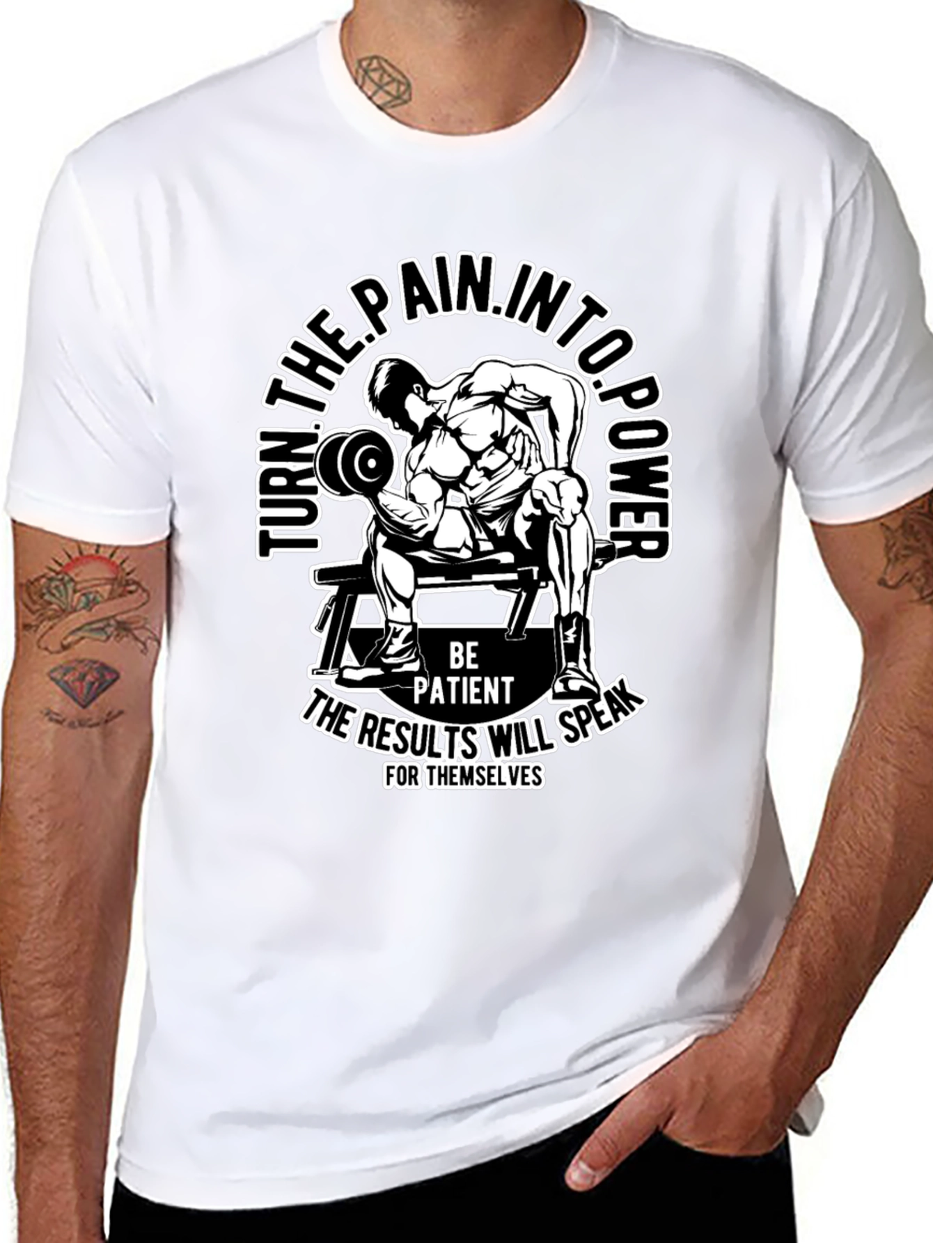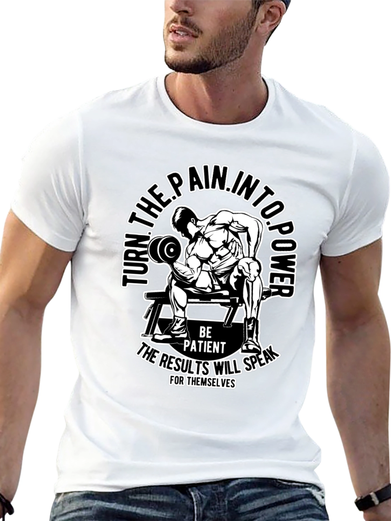 Show off your dedication with this striking black t-shirt. The bold graphic features a weightlifter and the empowering message 'Turn the Pain Into Power', 'Be Patient', and 'The Results Will Speak For Themselves'. Made from comfortable material, it's ideal for workouts or casual wear. The eye-catching design and motivational message will inspire you and those around you to push your limits. A perfect choice for fitness enthusiasts who want to make a statement.