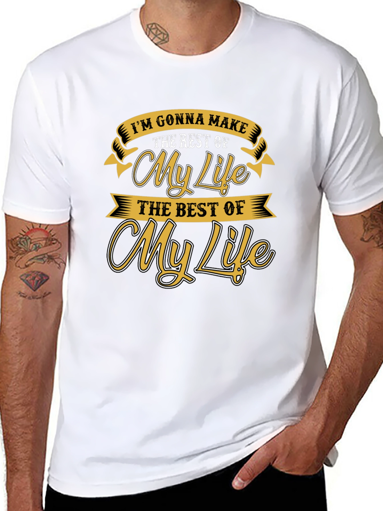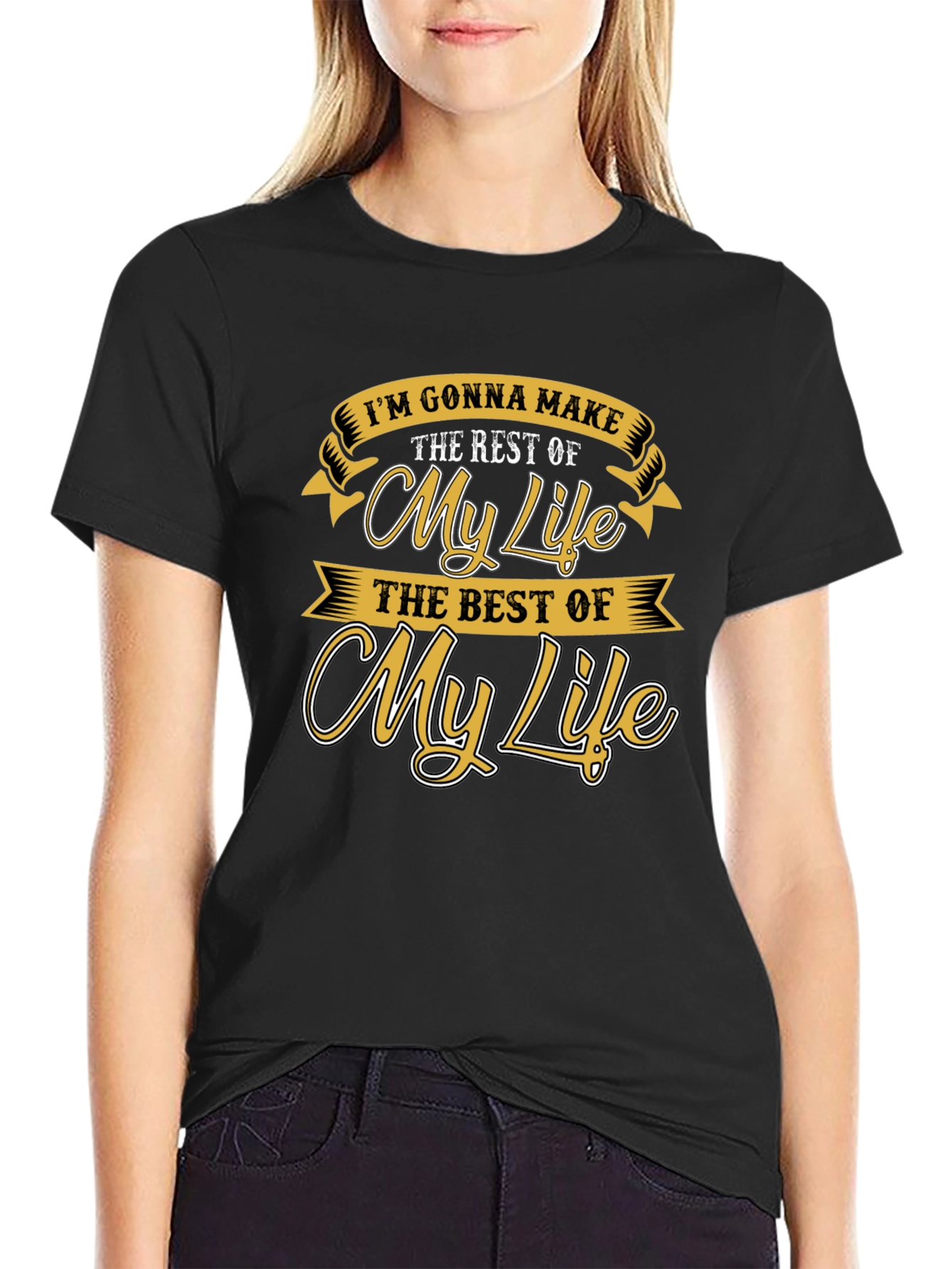 Showcase your positive attitude with this stylish black T-shirt. The tee features a bold, eye-catching graphic print in golden hues, proclaiming 'I'm Gonna Make The Rest of My Life The Best of My Life.' Made from a soft, comfortable fabric, this shirt is perfect for everyday wear. Its classic fit and short sleeves make it a versatile addition to any wardrobe, easily paired with jeans, shorts, or casual pants. Whether you're hitting the gym, running errands, or simply relaxing at home, this motivational tee will keep you looking and feeling great. Spread positive vibes and inspire those around you with this unique and empowering design.