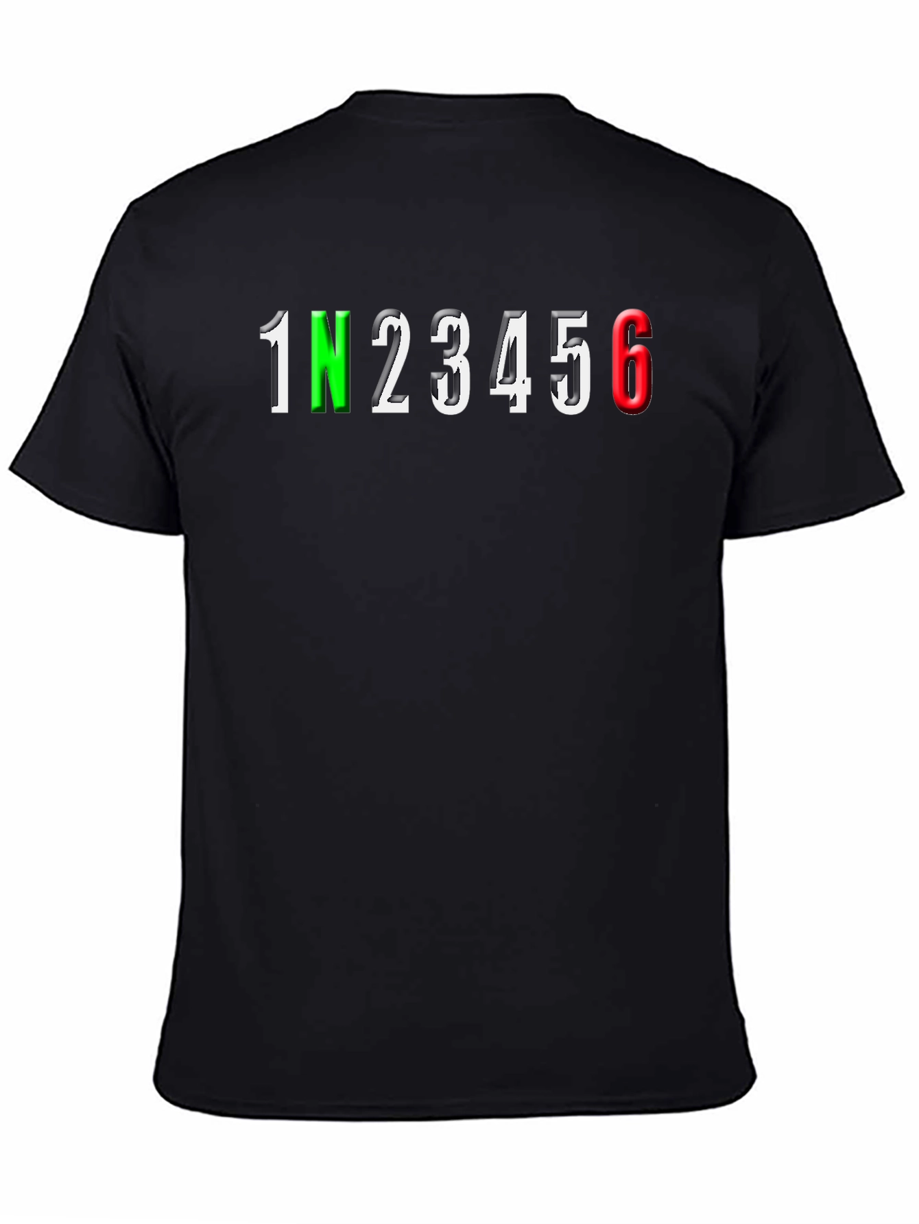 Show off your love for motorcycles with this unique black t-shirt. The shirt features a bold '1N23456' graphic across the chest, representing motorcycle gear shifting. The '1' and '6' are colored green and red, respectively. Made from a comfortable and durable fabric, this tee is perfect for casual wear, motorcycle meetups, or as a gift for the bike enthusiast in your life. The classic fit and striking design ensure you'll stand out from the crowd. Ride in style and comfort!