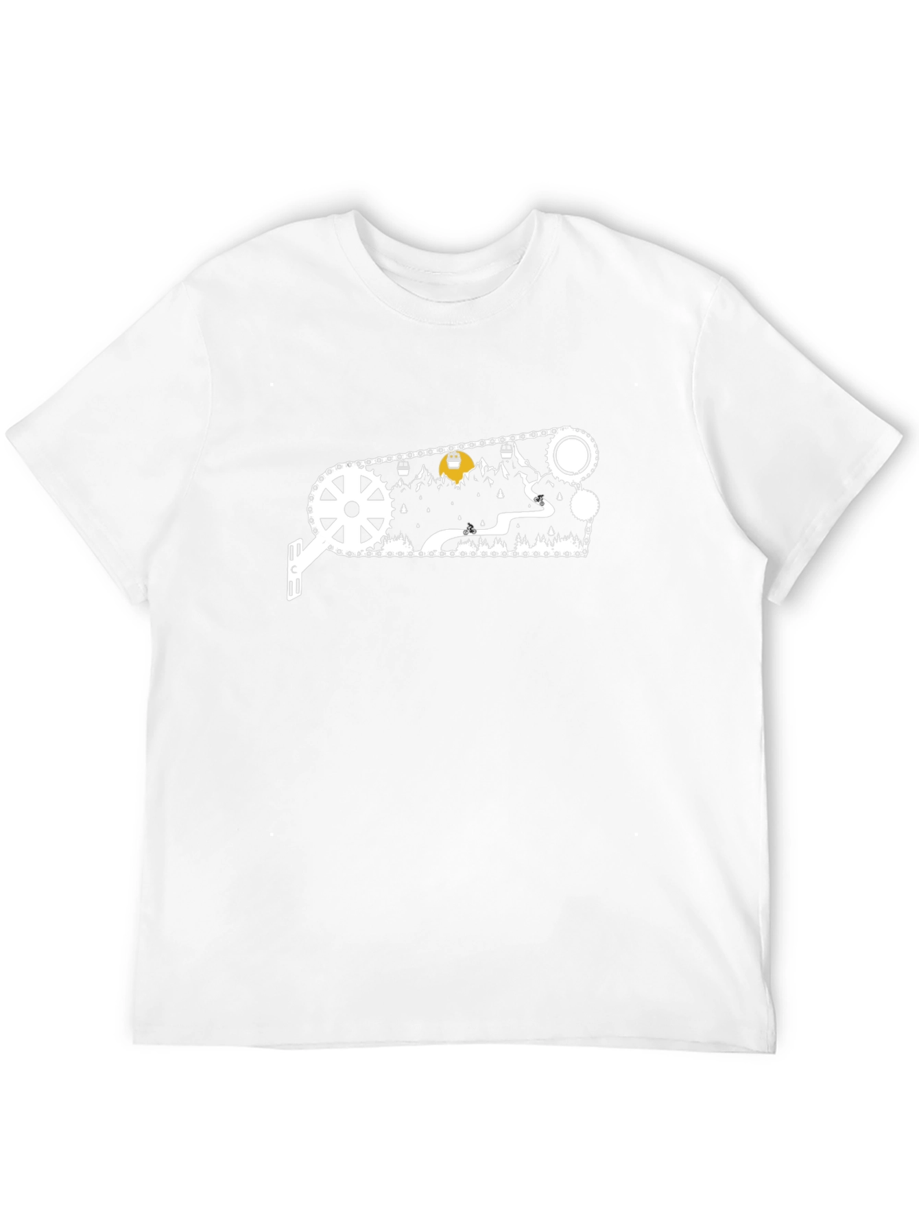 This sleek black t-shirt features a unique mountain biking graphic. The design incorporates a bicycle chain and gears to create a scenic landscape, complete with mountains, trees, and a cyclist. A cool blend of gears and the great outdoors, this tee is perfect for cycling enthusiasts and nature lovers alike. Made from a soft, comfortable fabric, it’s ideal for casual wear, workouts, or outdoor adventures. Show off your passion for cycling with this stylish and eye-catching t-shirt. Great for everyday wear or as a gift for the biker in your life.