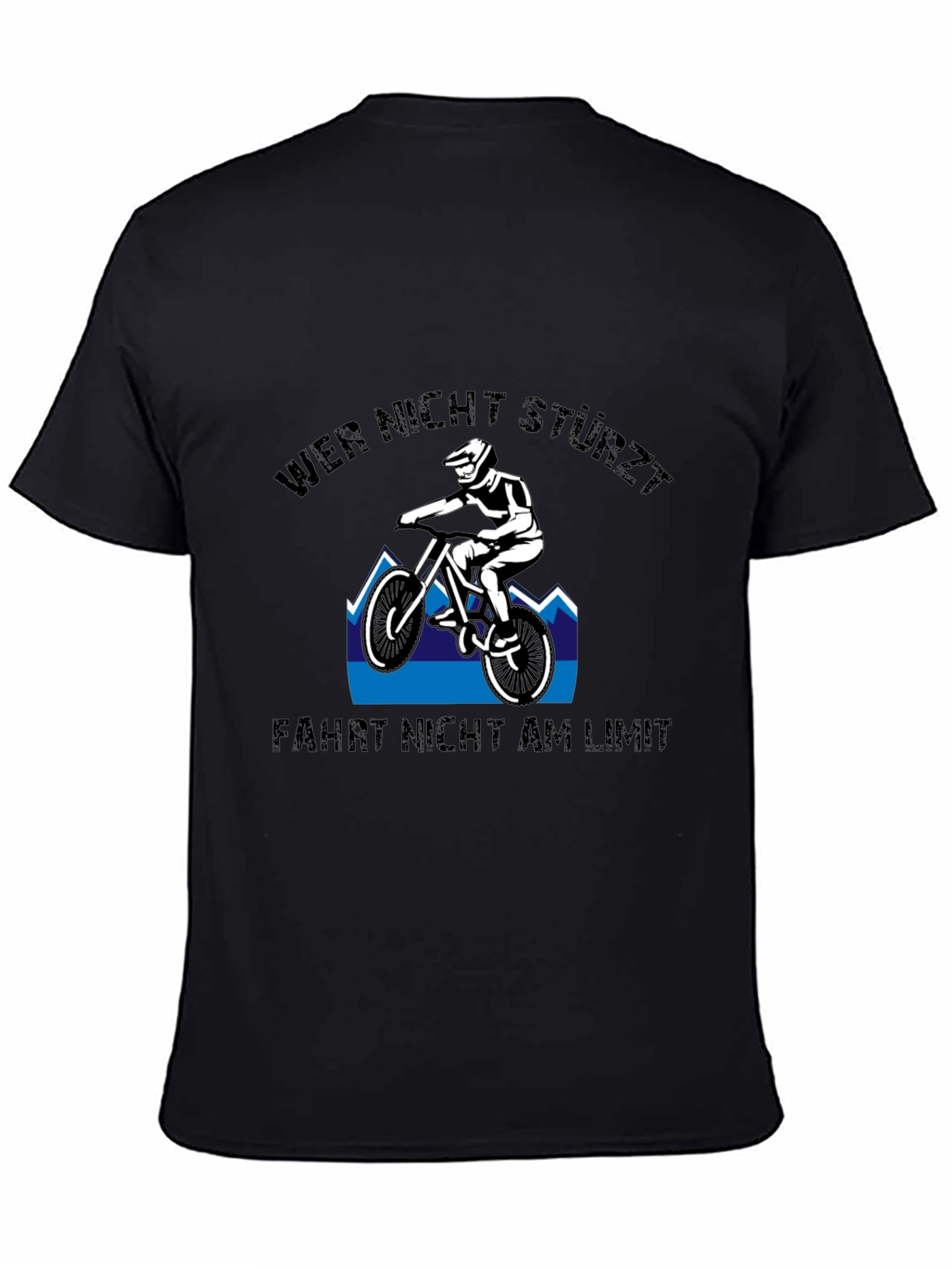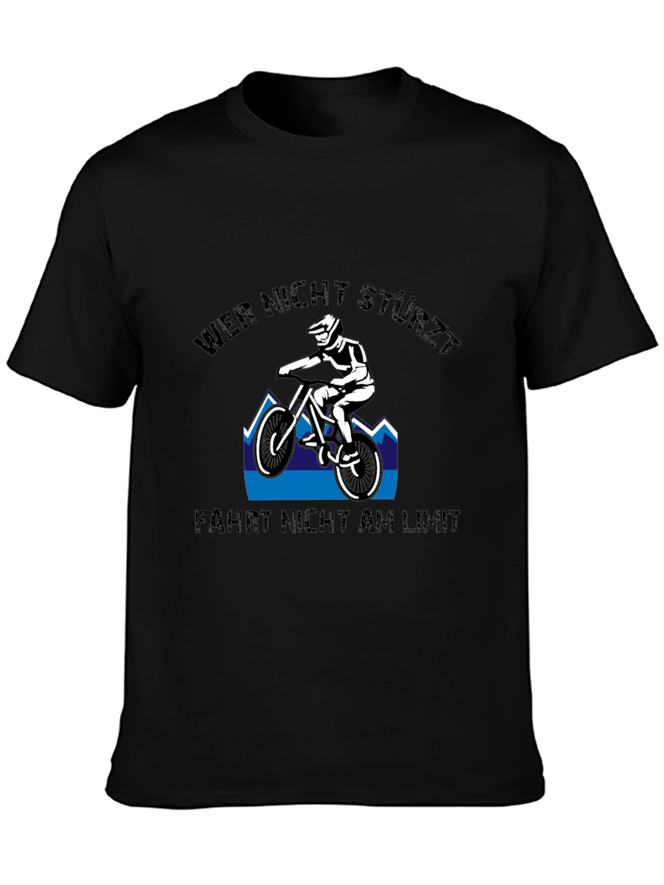 Embrace your inner daredevil with this striking black t-shirt featuring a bold graphic design. The shirt showcases a mountain biker conquering rugged terrain against a backdrop of stylized blue mountains. Above and below the image, impactful German text reads "Wer nicht stürzt, fährt nicht am Limit," which translates to "He who doesn't fall doesn't ride at the limit." The design is perfect for mountain biking enthusiasts and thrill-seekers alike. Made from comfortable, breathable material, this shirt is ideal for casual wear or as a statement piece. Show off your adventurous spirit with this unique and eye-catching tee.