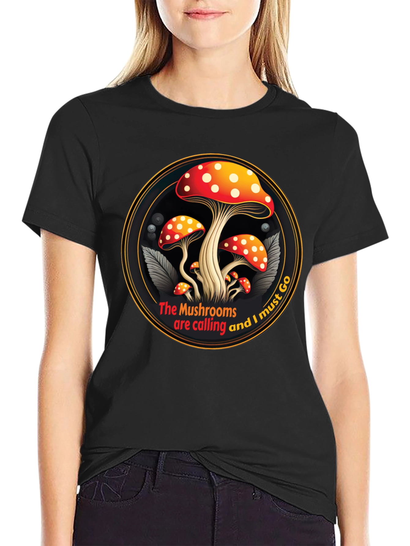 Embrace your love for nature with this unique black graphic tee. The shirt features a bold and colorful mushroom design encircled by the phrase 'The Mushrooms are calling and I must go'. The eye-catching graphic is perfect for nature enthusiasts and those with a whimsical sense of style. Made from a comfortable, breathable fabric, this t-shirt is ideal for everyday wear. Pair it with jeans for a casual look or dress it up with a jacket for a night out. This tee is a great way to express your personality and showcase your passion for the outdoors.