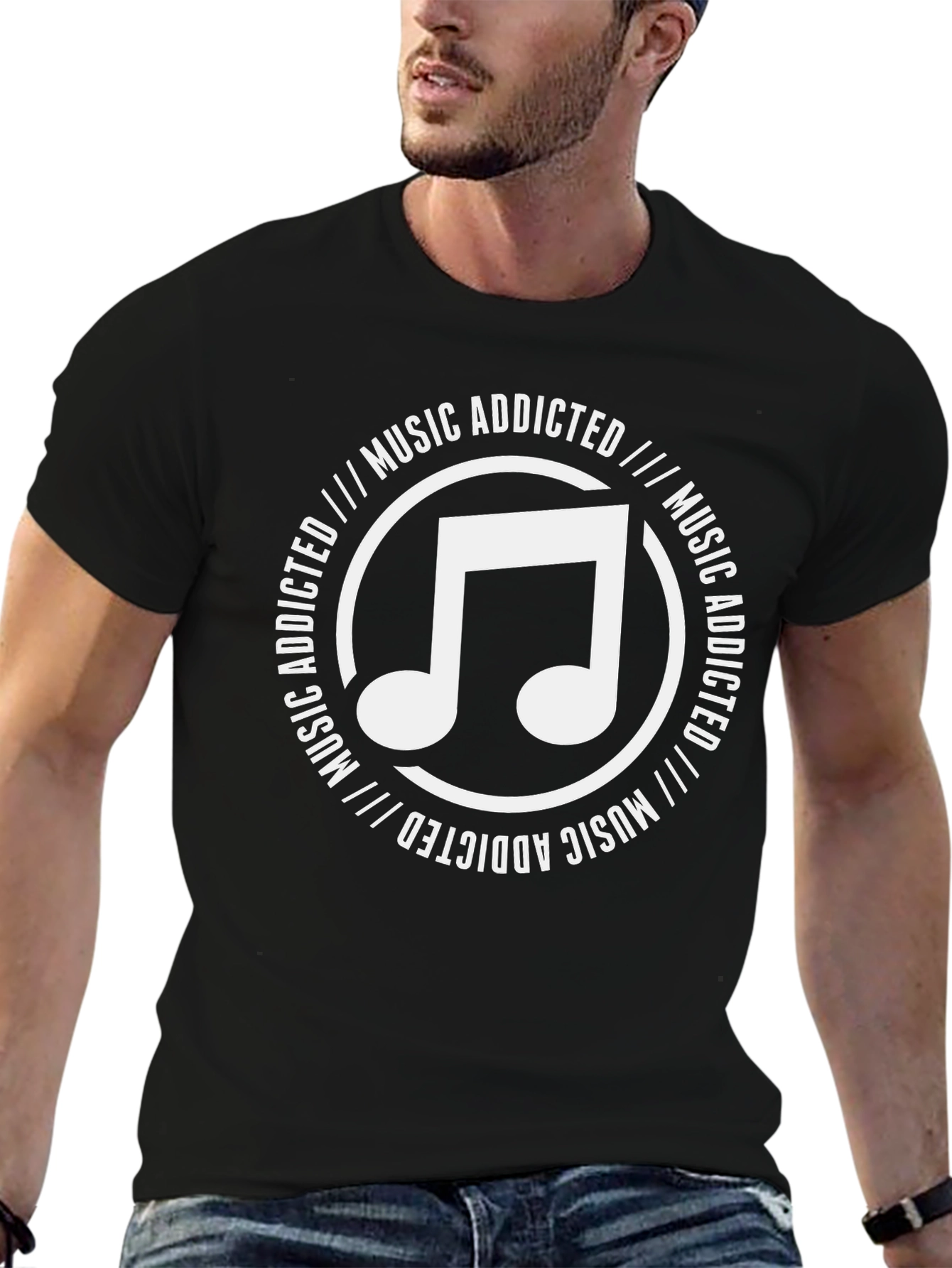 Show your love for music with this stylish black t-shirt. Featuring a bold, circular design with the words "MUSIC ADDICTED" surrounding a prominent musical note, this tee is perfect for music lovers of all kinds. The design is printed in white, contrasting against the dark fabric for a standout look. Made from a comfortable material, this shirt is ideal for everyday wear, concerts, or casual outings. Express your passion for music with this eye-catching and trendy t-shirt. A great gift for the music obsessed!