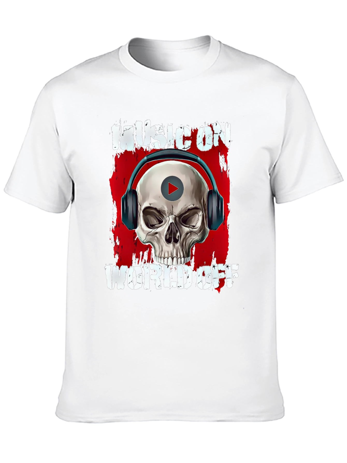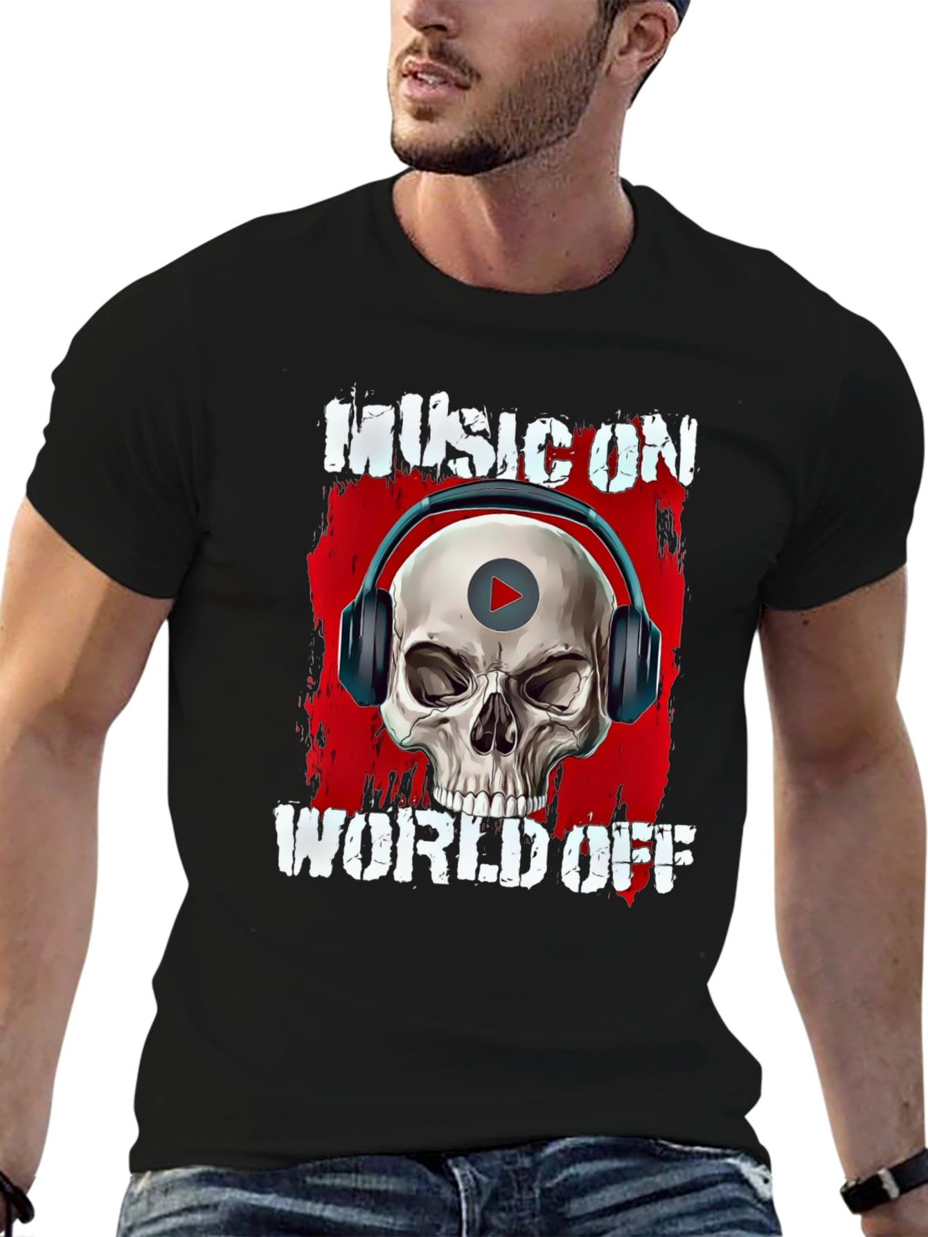 Express yourself with this edgy black t-shirt featuring a skull wearing headphones. The design includes a striking red and white graphic with the words "Music On World Off." Perfect for music lovers with a bold sense of style, this tee is comfortable and sure to turn heads. Wear it to concerts, casual outings, or anytime you want to make a statement. Made from a soft, breathable fabric, this t-shirt is both stylish and comfortable, making it a must-have addition to any wardrobe.