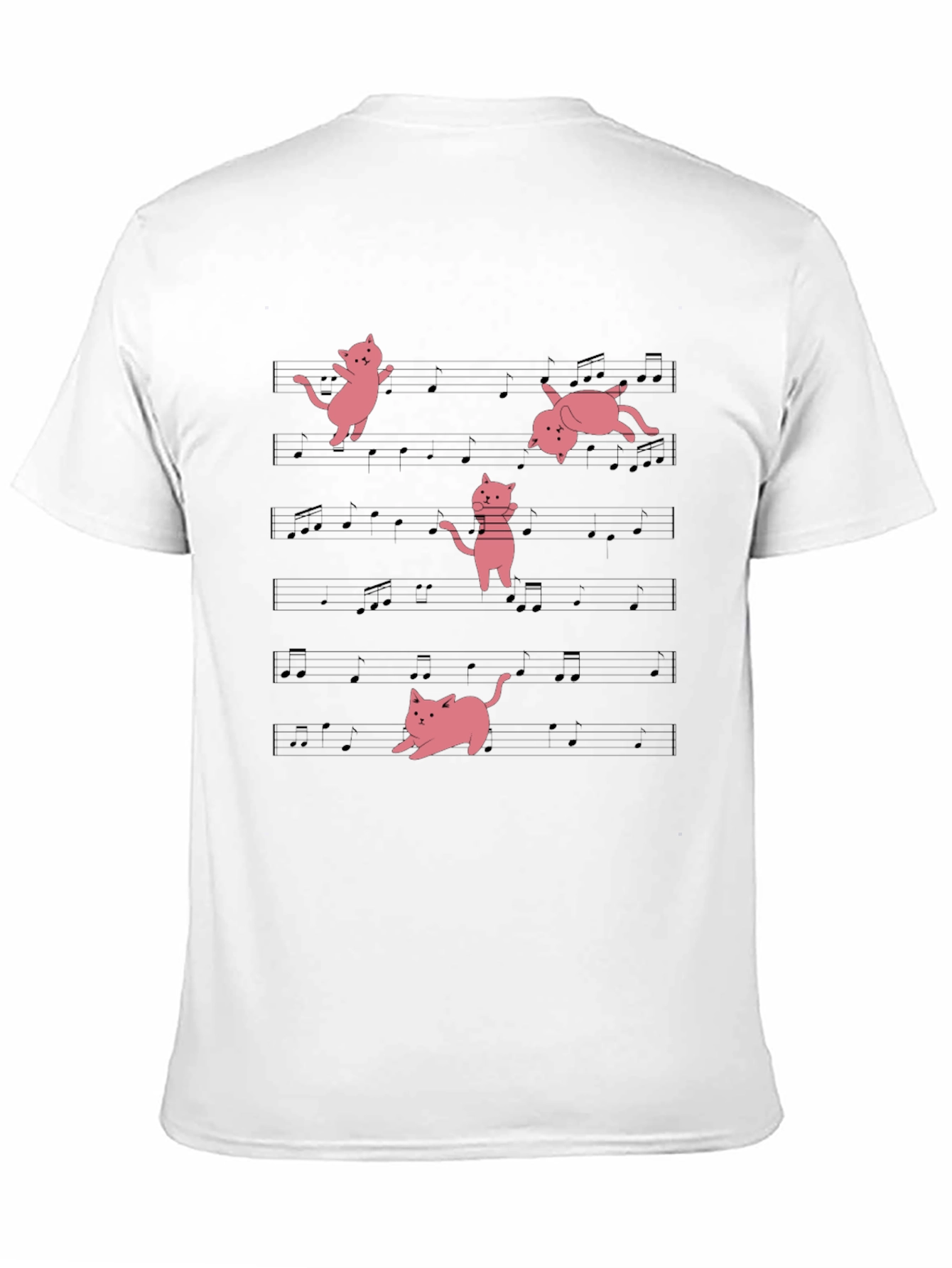 Show off your love for music and cats with this unique black T-shirt! This eye-catching tee features a playful design of pink cartoon cats dancing across a backdrop of musical notes. Made from a comfortable and breathable fabric, this shirt is perfect for casual wear, concerts, or just lounging around the house. The fun and whimsical design is sure to spark conversations and bring a smile to everyone's face. A must-have for any cat lover or music enthusiast! Great for everyday use.