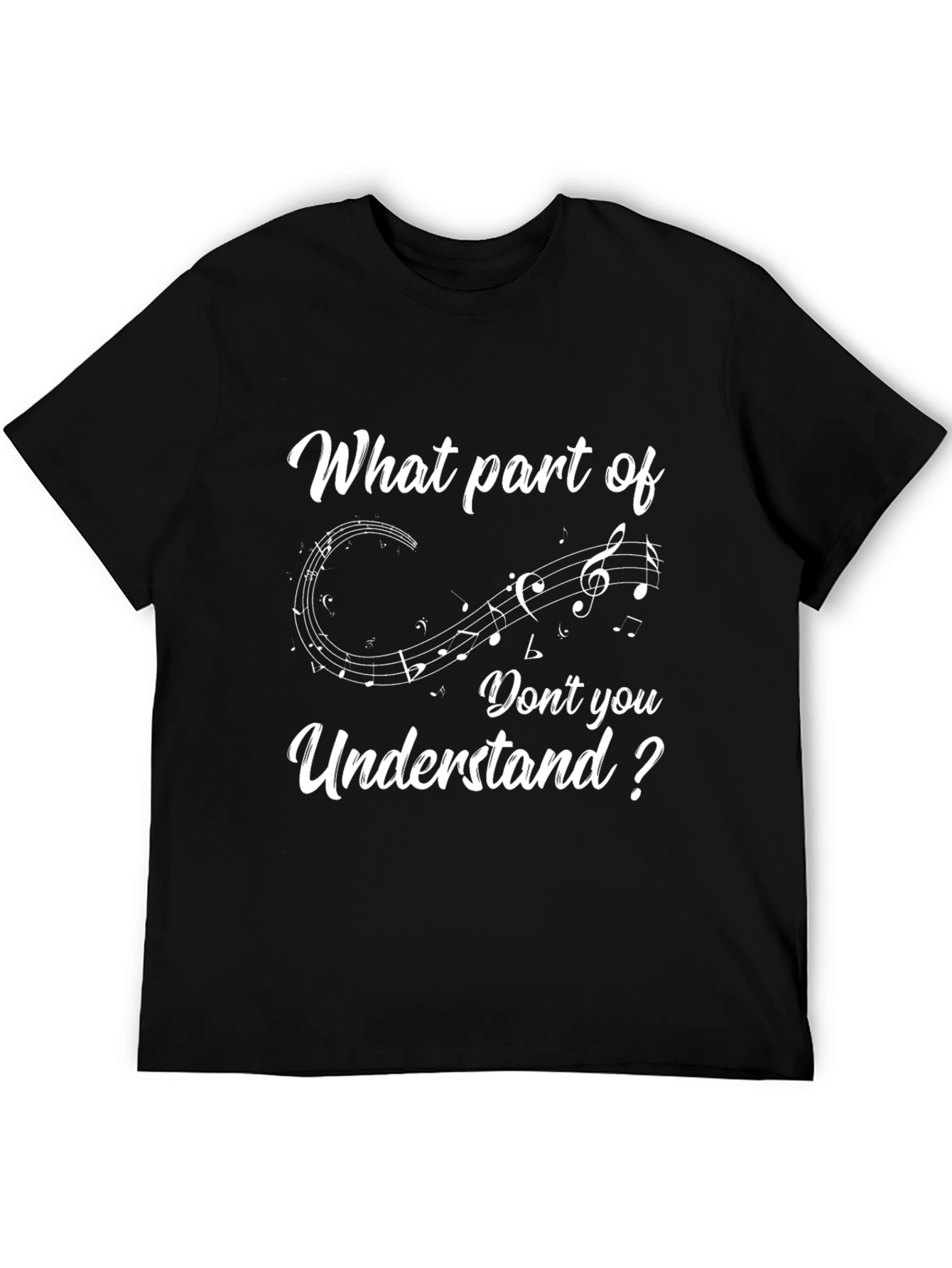 Express your love for music with this stylish black t-shirt. Featuring a playful design of musical notes and a treble clef, paired with the witty phrase "What part of Don't you Understand?", this shirt is a fun way to show your passion. Made from a comfortable, breathable fabric, it's perfect for everyday wear, music classes, band practice, or casual outings. The classic fit and soft material ensure all-day comfort. Make a statement and let your love for music shine with this eye-catching tee.