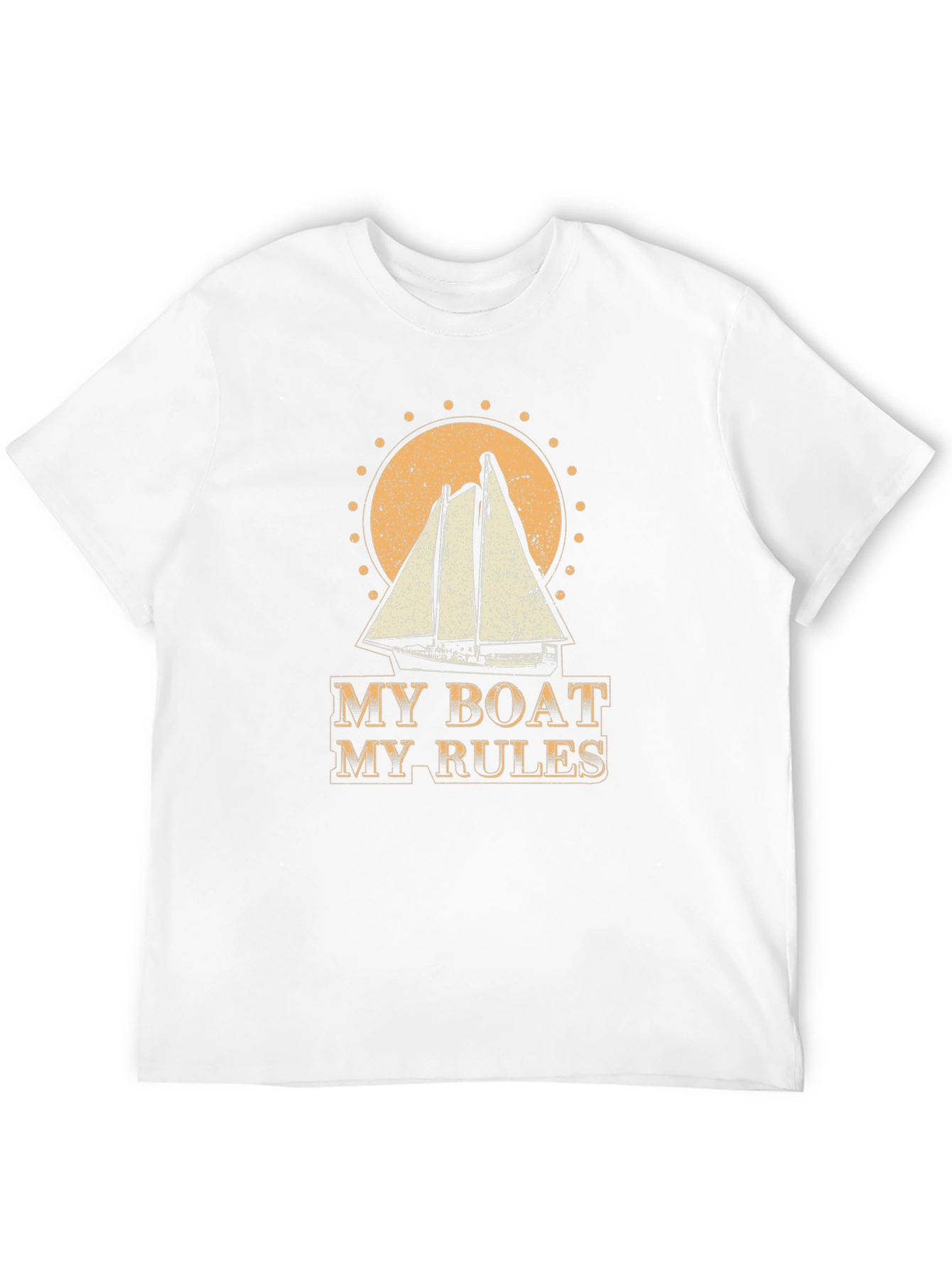 Set sail in style with this bold graphic tee! The black t-shirt features a weathered print of a sailboat with the phrase "My Boat My Rules" in a vintage-inspired font. The design is set against a circular backdrop, giving it a nautical and adventurous feel. Made from comfortable, breathable fabric, this tee is perfect for casual wear, boating trips, or simply showing off your love for the open water. Whether you're a seasoned sailor or a weekend enthusiast, this shirt is sure to make a statement. Add it to your wardrobe for a touch of maritime flair!