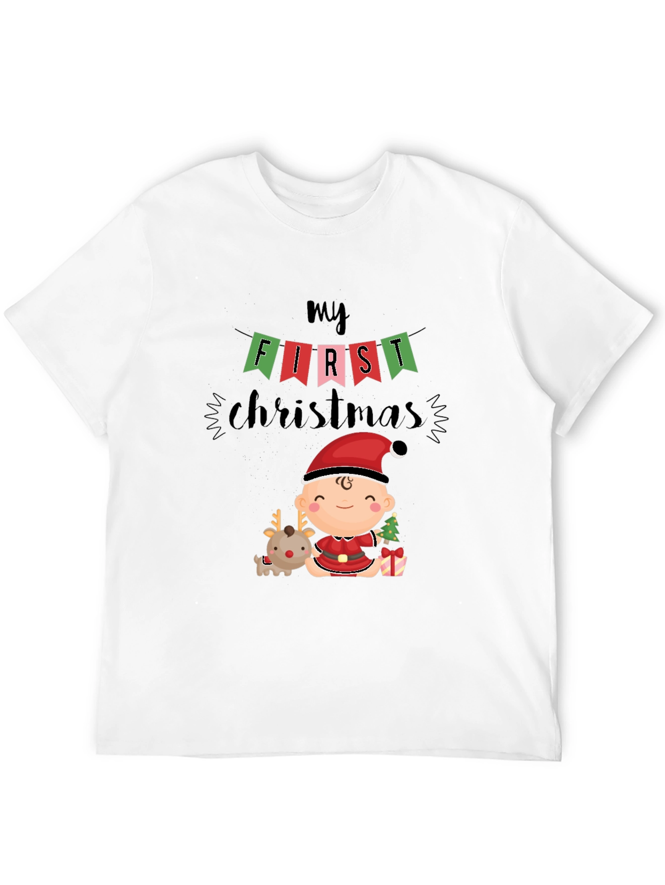 Celebrate your little one's first Christmas with this adorable black t-shirt. The design features a festive graphic with "my first christmas" text, colorful banner flags, and a cute baby dressed as Santa, accompanied by a reindeer and a Christmas tree. This charming t-shirt is perfect for holiday photos, family gatherings, or as a special Christmas gift. Made from comfortable materials, it's gentle on your baby's skin and easy to care for. Make this Christmas unforgettable with this delightful t-shirt!
