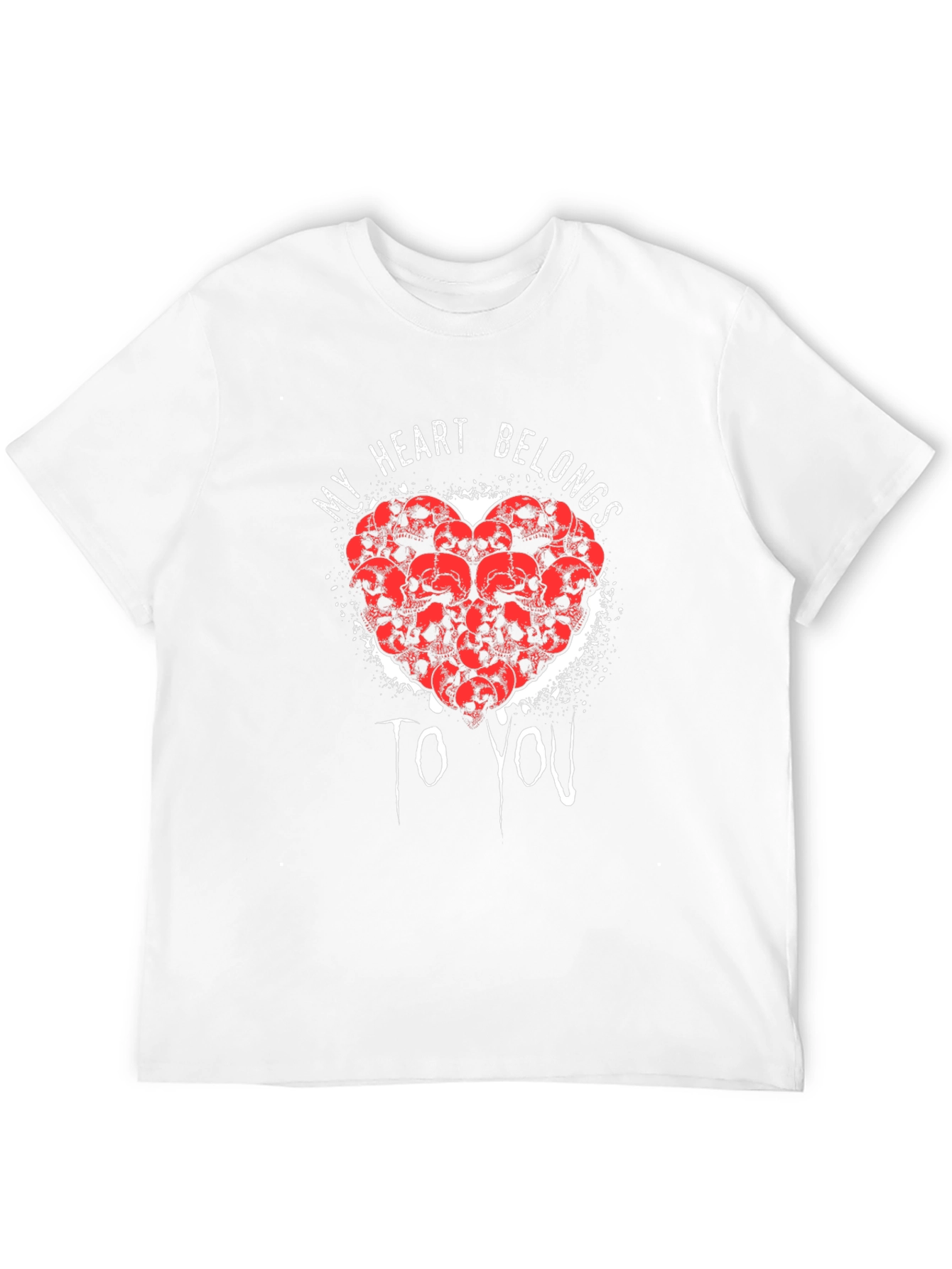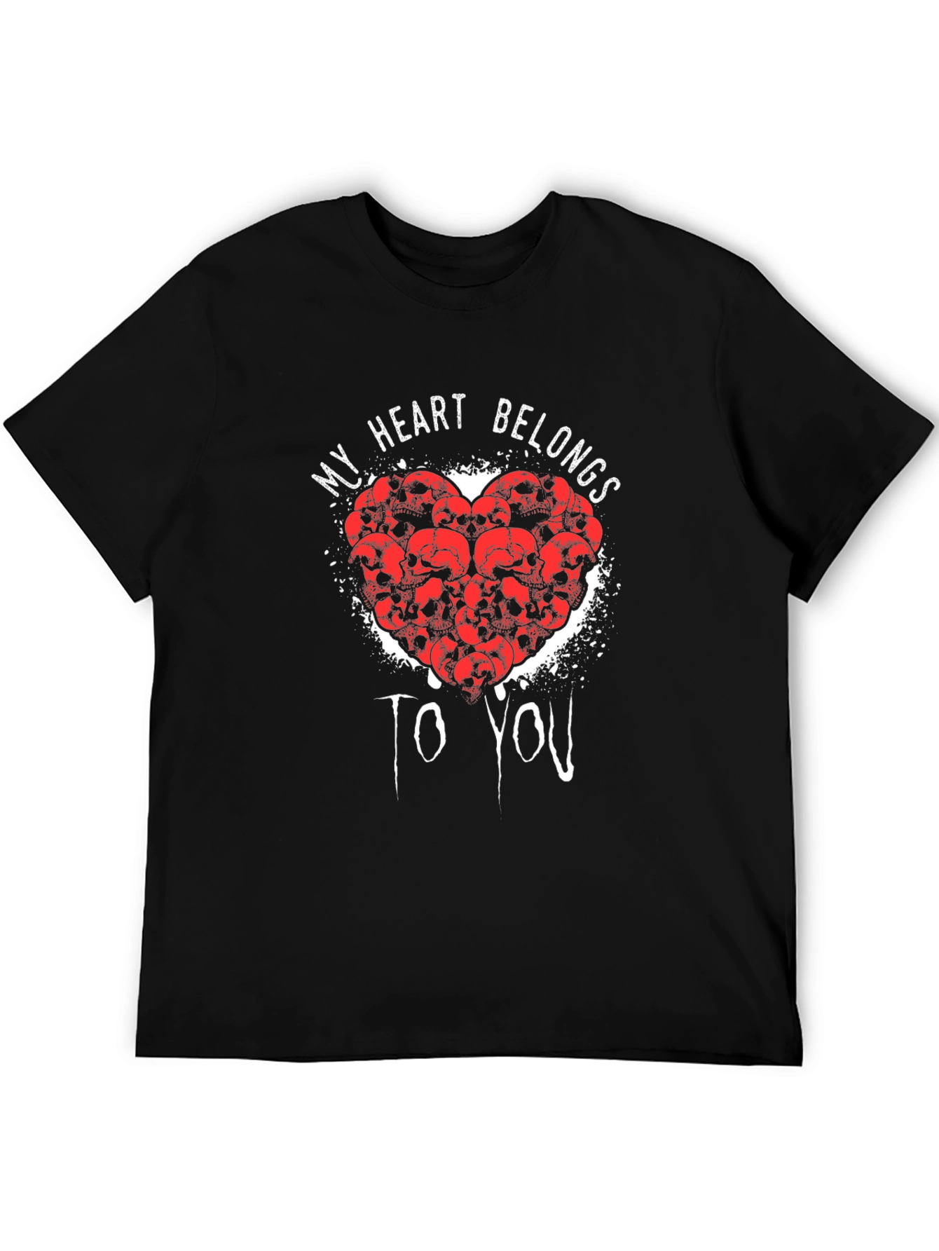 Show your gothic love with this unique graphic t-shirt. The design features a heart made of red skulls, surrounded by a splatter effect, with the words "MY HEART BELONGS TO YOU" in a cool font. This soft, black tee is perfect for those who love edgy and romantic styles. Wear it to concerts, casual outings, or as a standout piece in your everyday wardrobe. A great gift for the gothic soul in your life! Express your unique style with this eye-catching piece.
