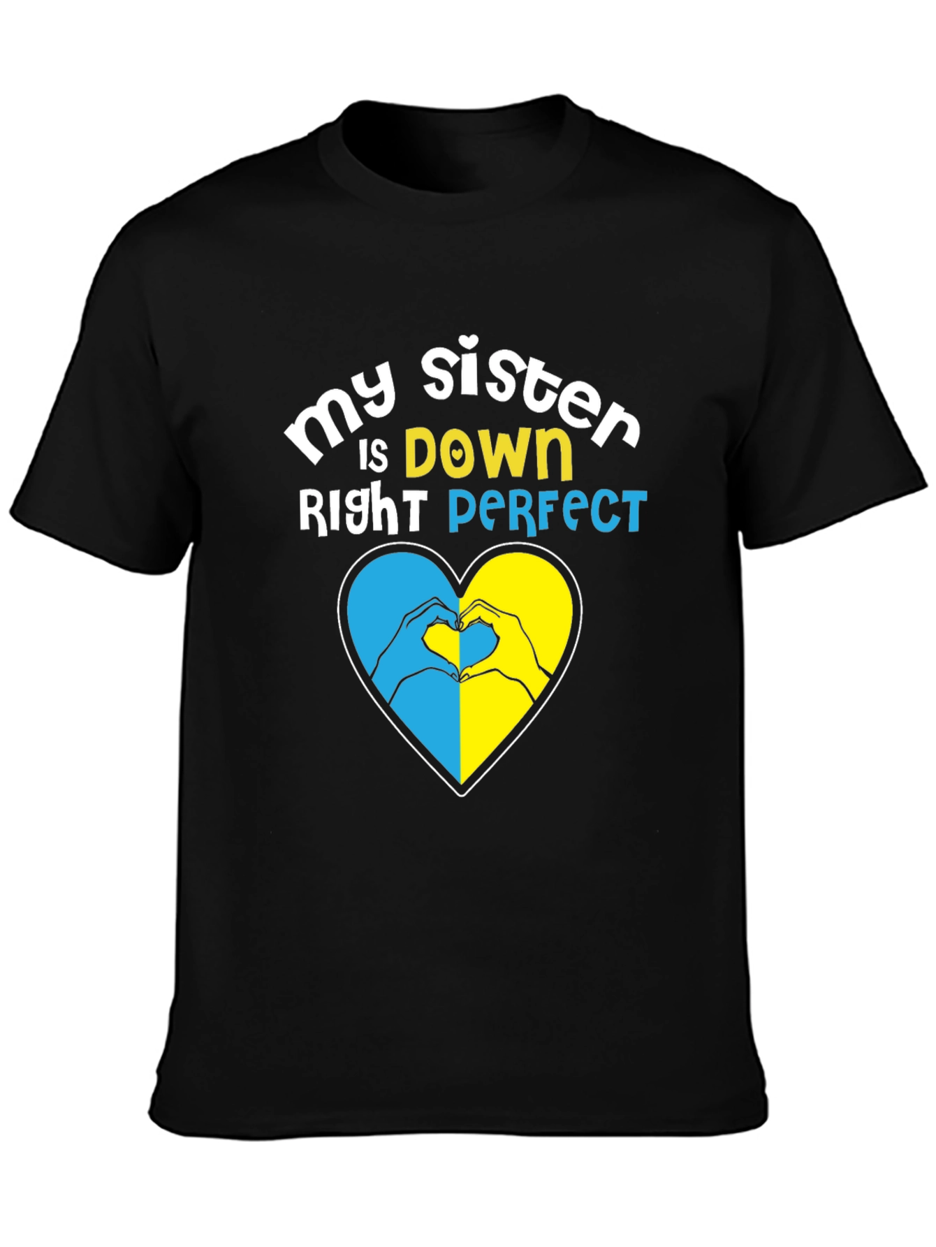 Show your love and support with this "My Sister is Down Right Perfect" T-shirt. This unique tee features the heartwarming message with 'DOWN' highlighted in yellow and 'PERFECT' in blue. Below the text is a heart design, with the left side in blue and right side in yellow, creating a striking visual effect. Inside the heart, hands are posed making a heart. This classic fit shirt is ideal for casual wear, family events, or to raise awareness. A thoughtful and stylish way to express your affection for your sister!