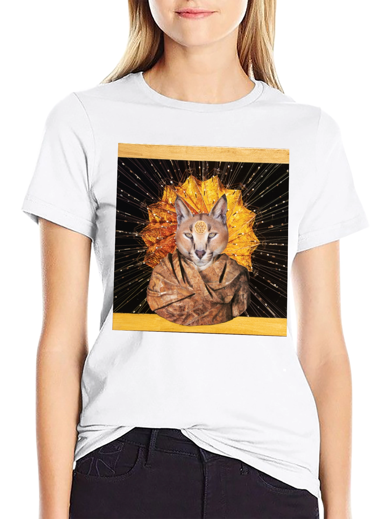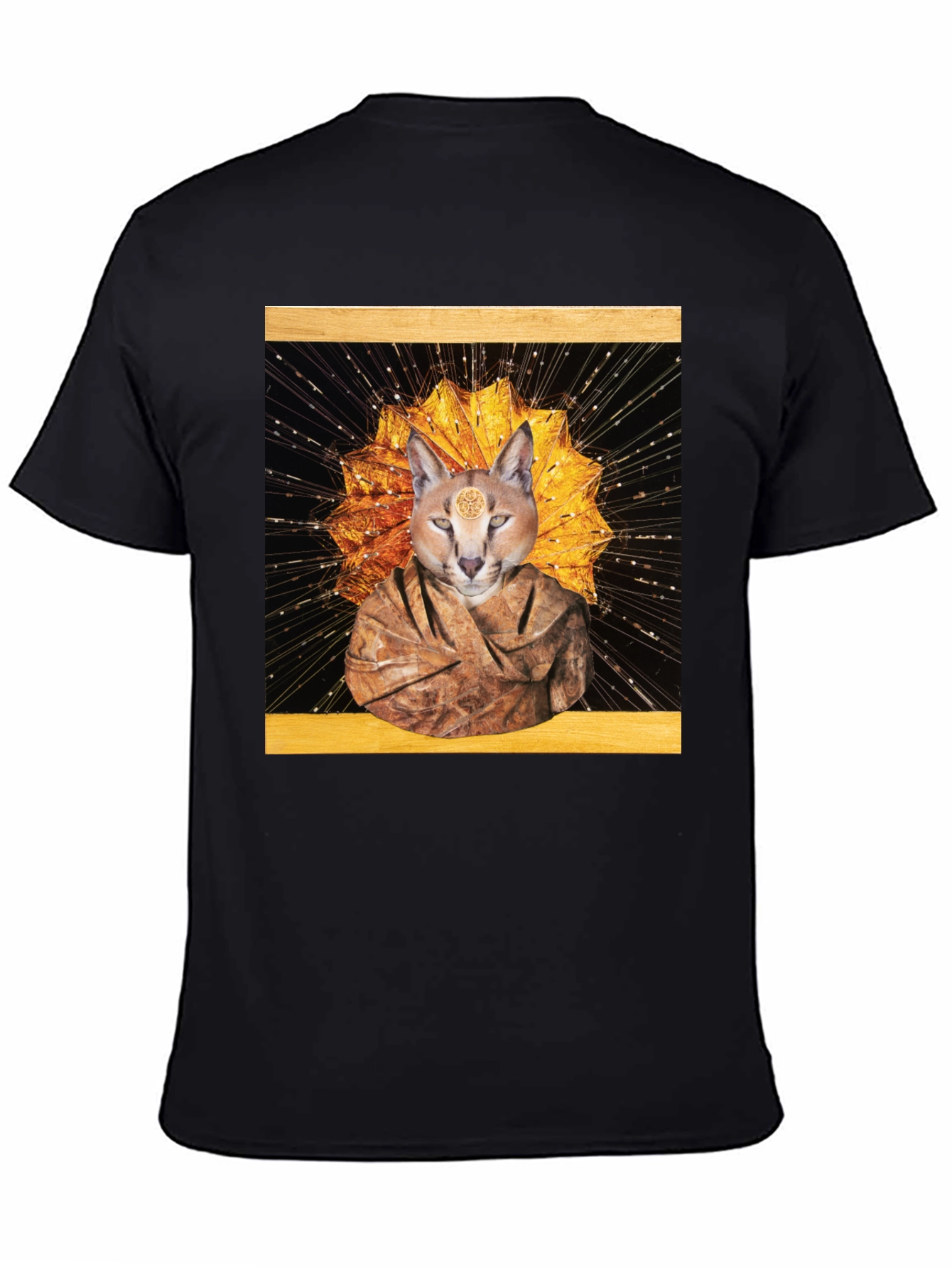 Embrace the enigmatic with this eye-catching black t-shirt. The design features a captivating image of a feline figure adorned in a monastic robe, set against a radiant golden starburst and intricate black background. This unique graphic tee offers a comfortable fit and is perfect for expressing your individual style. The high-quality print ensures a vibrant, long-lasting design. Wear it casually or dress it up – this distinctive t-shirt is a conversation starter, ideal for those who appreciate art, mysticism, and bold fashion statements.