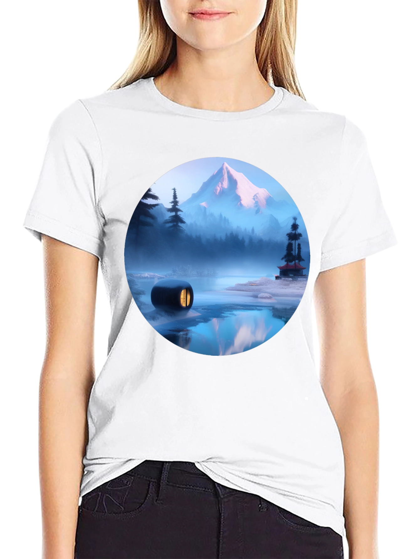 Embrace nature's serenity with this unique black t-shirt, featuring a captivating circular graphic design. A majestic mountain backdrop is reflected in a misty lake, enhanced by a futuristic cabin design. The rich blue tones add depth to the scene. Made from comfortable material, this casual wear combines artistic flair with everyday functionality. It is a statement piece perfect for nature lovers and those seeking a touch of fantasy in their wardrobe. Stand out with this wearable artwork and elevate your casual style.