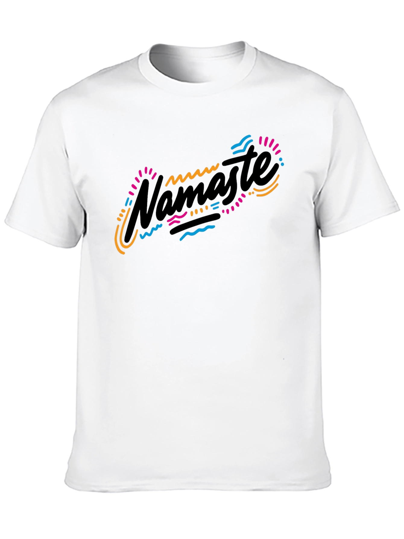 Showcase your zen with this stylish black t-shirt featuring a vibrant 'Namaste' graphic. The design incorporates playful lines and dots in pink, orange, and blue. Made from comfortable cotton blend, this tee offers a classic fit that suits any casual occasion. The unique graphic design adds a touch of modern flair, making it a standout piece in your wardrobe. Whether you're practicing yoga, running errands, or meeting friends, this t-shirt brings a sense of peace and style to your day. Perfect for those who love unique, eye-catching apparel with a message.