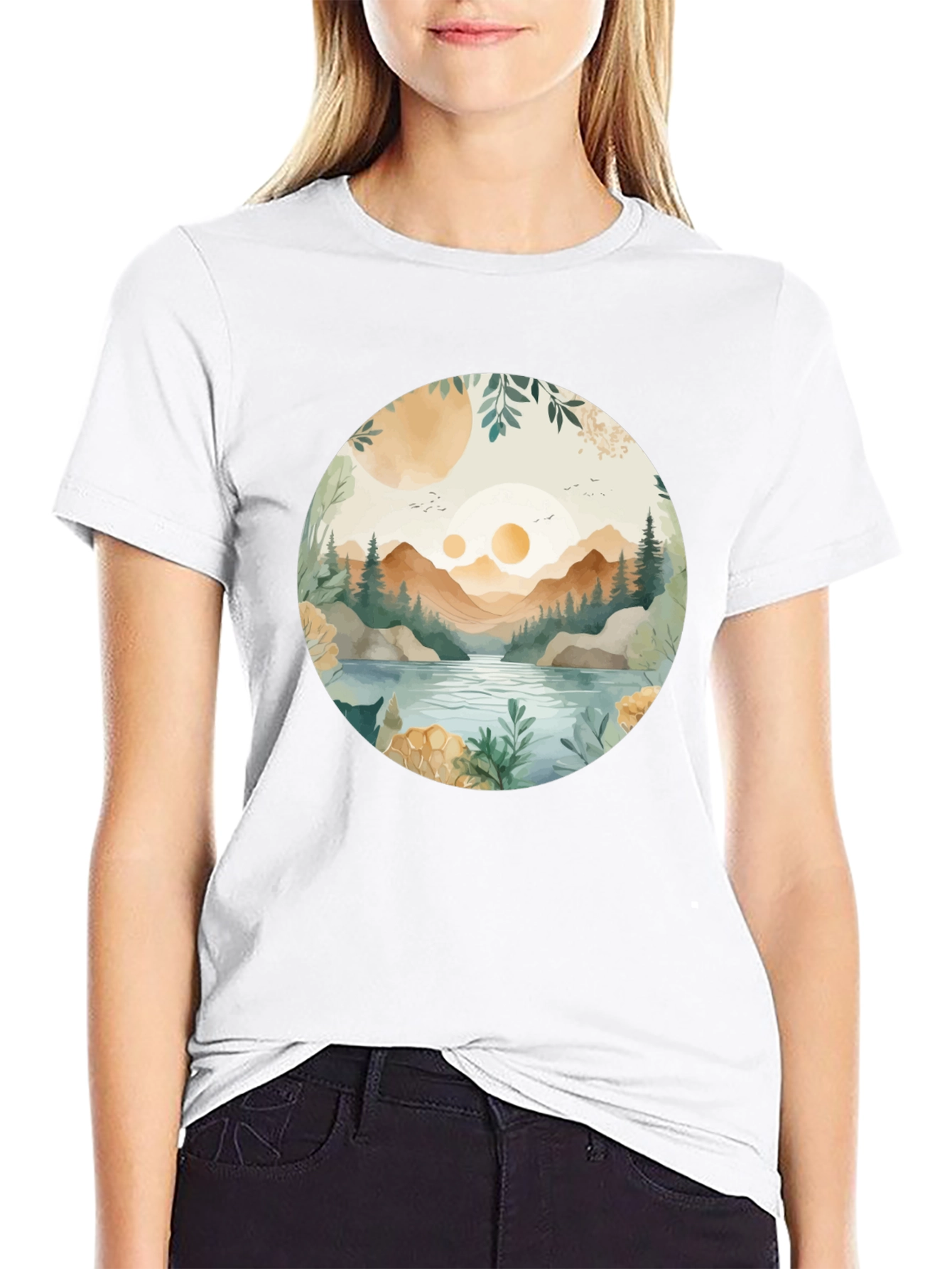 Embrace nature with this unique graphic tee. The design features a serene landscape with mountains, trees, water, and celestial bodies. The tee is black and made of soft, comfortable material, perfect for everyday wear. The landscape graphic is circular and aesthetically pleasing. Pair it with jeans or shorts for a relaxed, stylish look. Ideal for casual outings, hikes, or simply lounging at home. Show off your love for nature with this eye-catching t-shirt.
