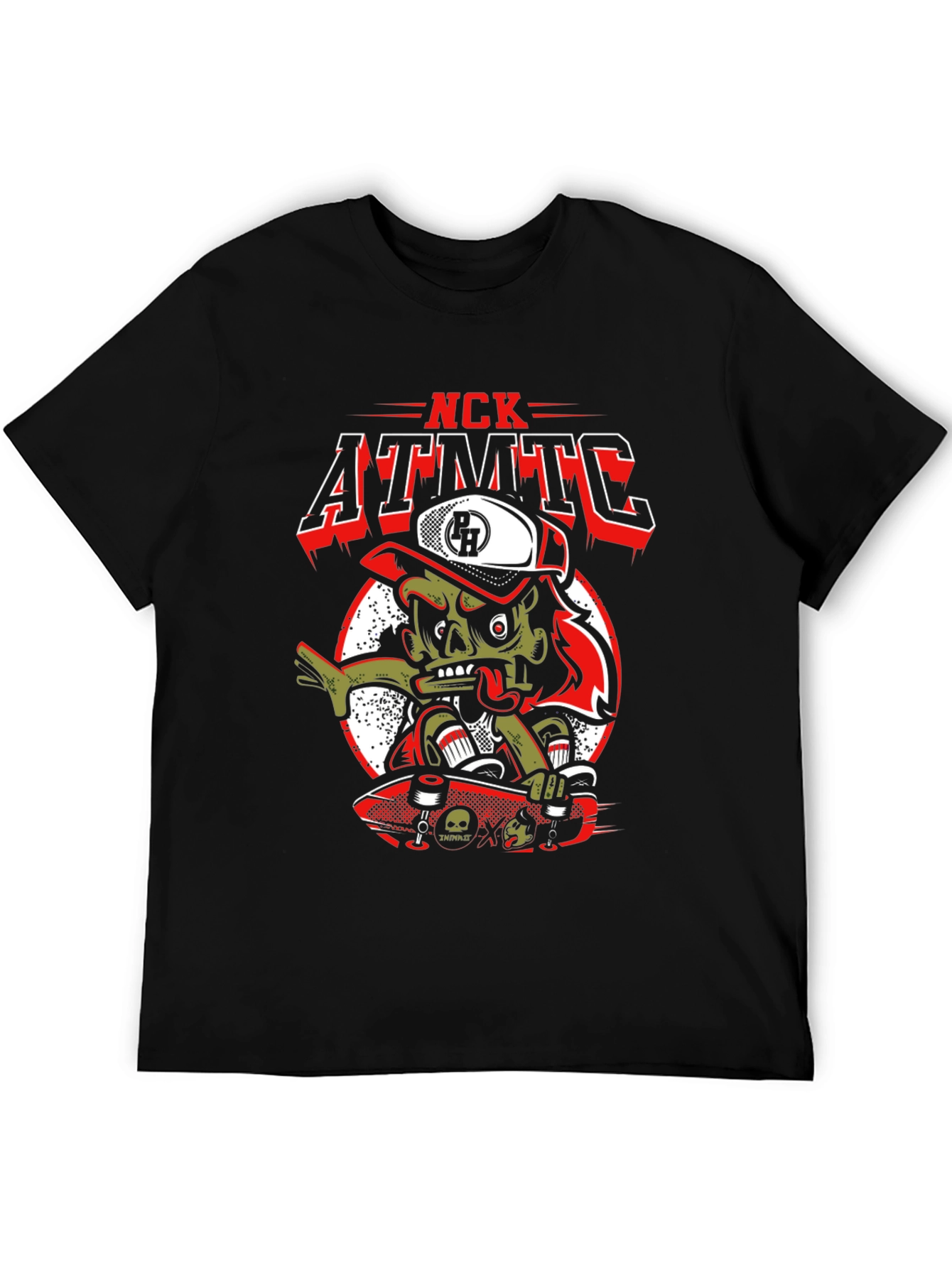 Showcase your unique style with this bold NCK ATMTC graphic print T-shirt. Crafted from comfortable, breathable fabric, this black tee features an eye-catching cartoon graphic of a skateboarder with a skull design, circled by red accents. The vibrant print makes a bold statement, perfect for casual outings or streetwear fashion. The T-shirt’s classic fit ensures all-day comfort and easy pairing with jeans, shorts, or joggers. A must-have addition to any wardrobe for those who appreciate standout design and effortless cool. Elevate your everyday look with this uniquely designed T-shirt!