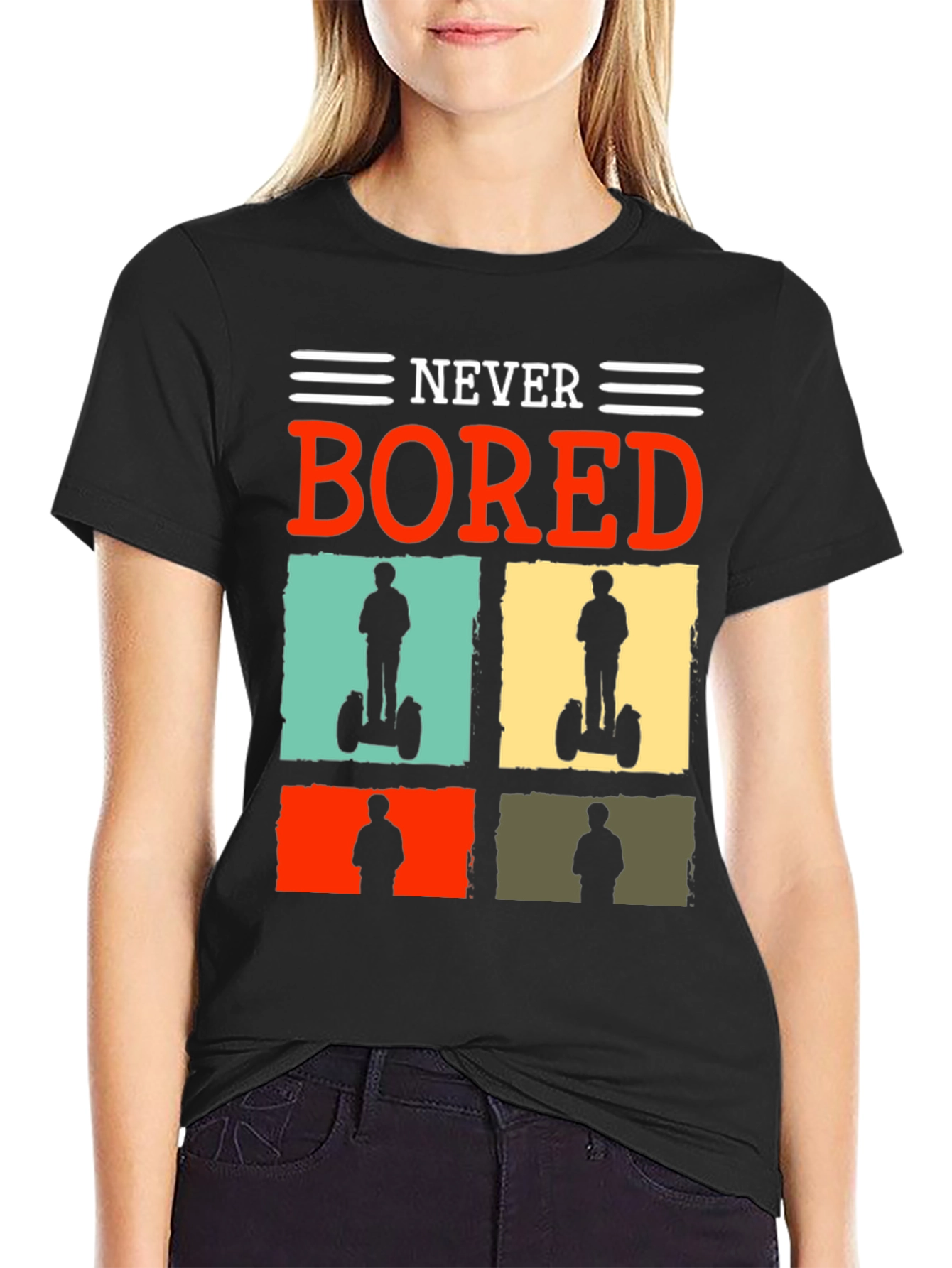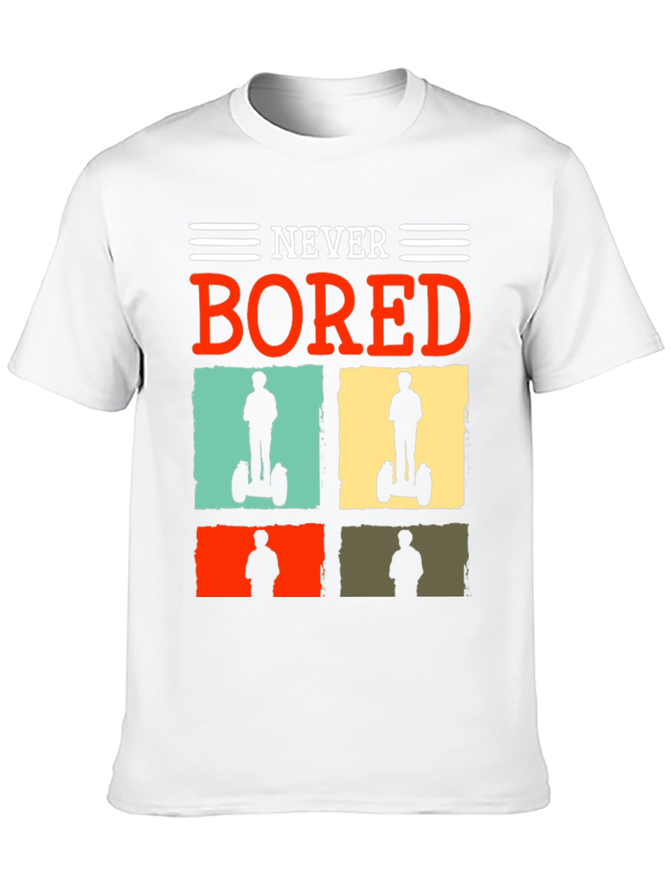 Showcase your love for Segways with this unique 'Never Bored' T-shirt. The design features a creative retro-style graphic with four panels, each depicting a silhouette of a person riding a Segway against different colored backgrounds. This adds a fun and vintage look to your wardrobe. Made from comfortable, breathable cotton, this T-shirt is perfect for everyday wear. Pair it with your favorite jeans or shorts for a casual, stylish look. A must-have for Segway enthusiasts who want to express their passion.
