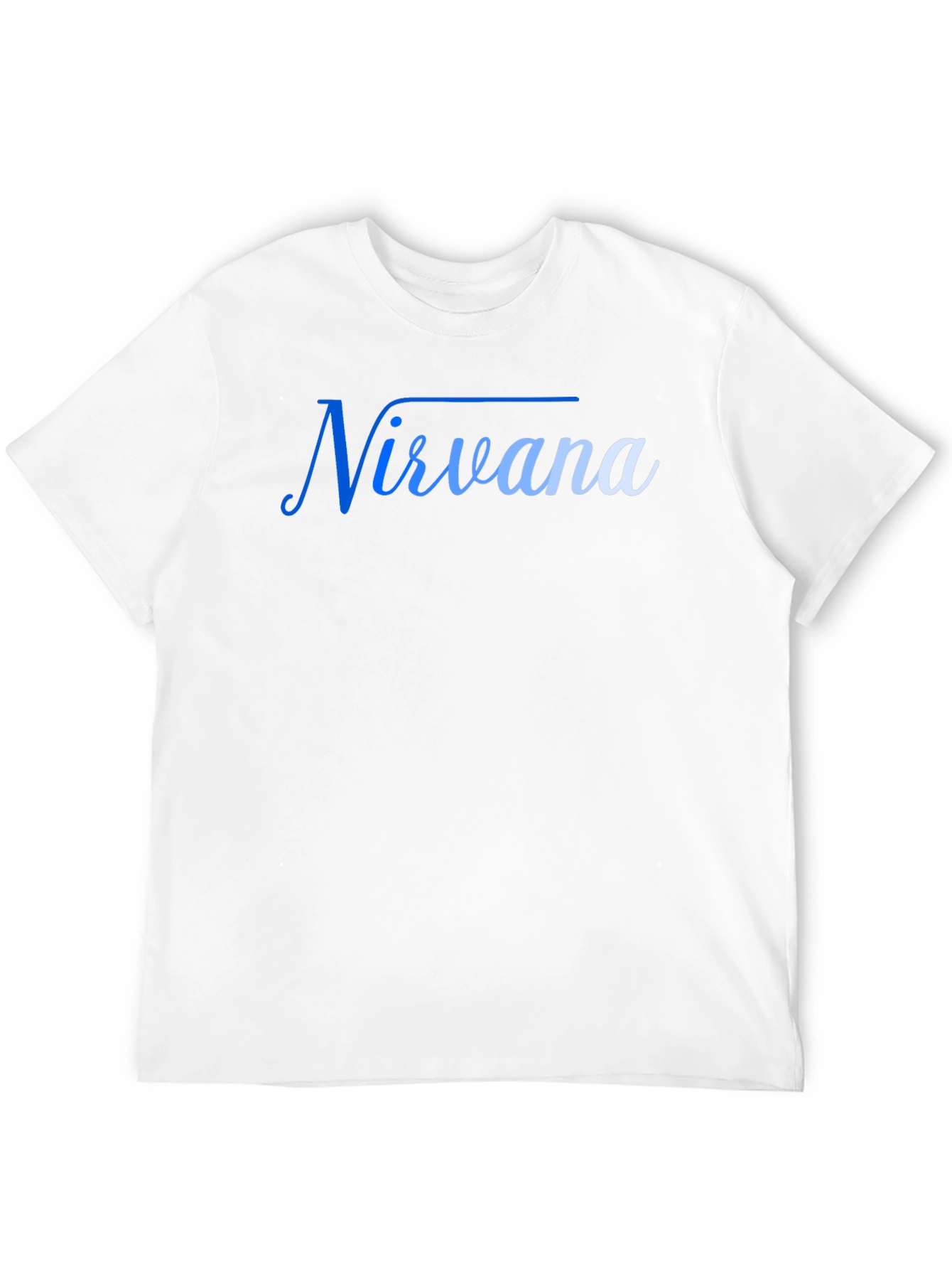 Show off your edgy style with this sleek black t-shirt featuring a vibrant, blue gradient "Nirvana" graphic. The striking design makes a bold statement. Made from a soft, breathable fabric, this tee offers both comfort and style. Perfect for casual outings, concerts, or expressing your unique personality. Pair it with jeans or shorts for a cool, effortless look. Make a statement wherever you go with this unique graphic tee that combines comfort and eye-catching design.