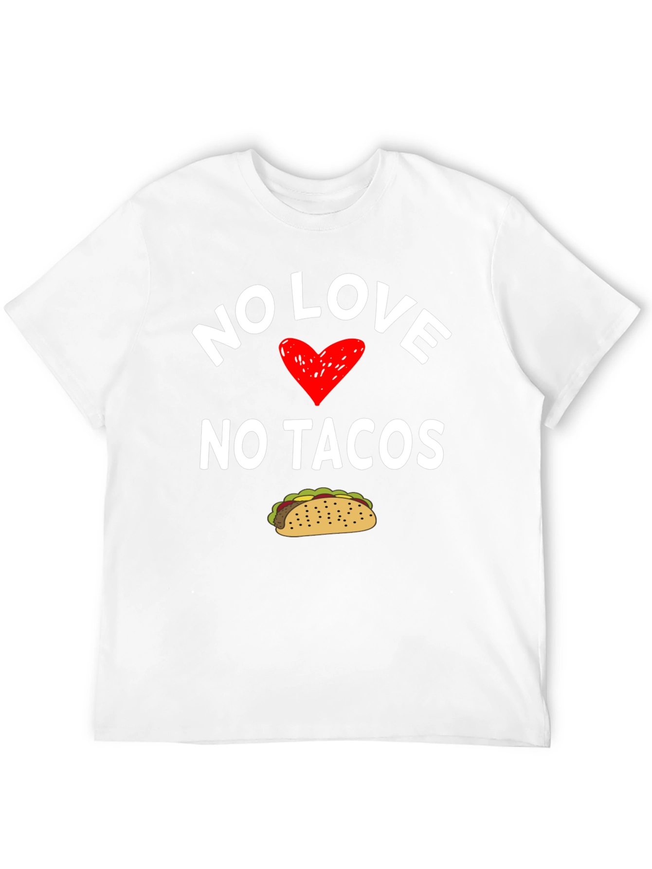 Express your priorities with this playful graphic t-shirt. Featuring a bold design with the phrase "No Love No Tacos," playfully replacing "Love" with a red heart icon and completing the design with a taco illustration. This tee is a fun statement piece. Constructed from soft, breathable fabric in a classic fit, it ensures all-day comfort. Perfect for casual outings, taco nights, or as a gift for the taco enthusiast in your life. Get ready to showcase your love for tacos in style!